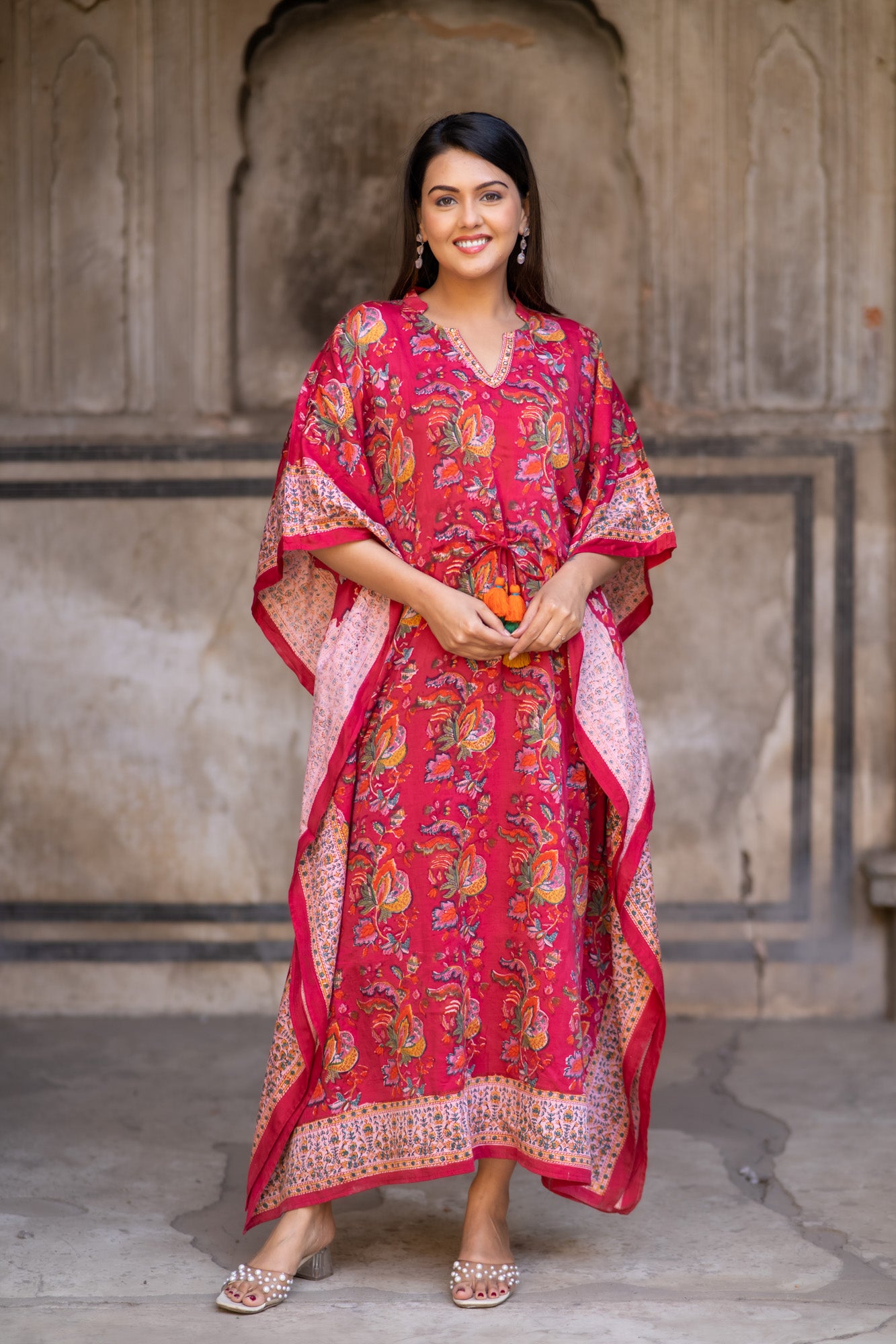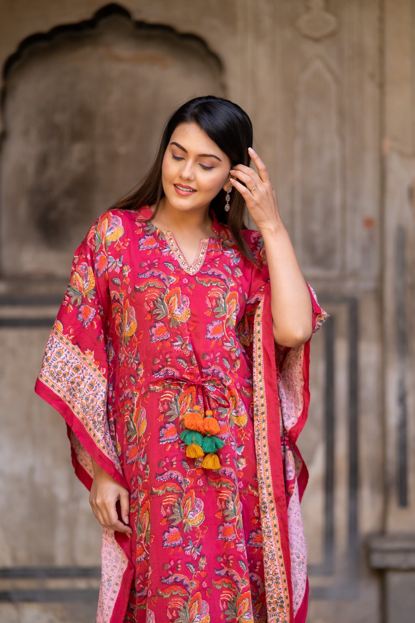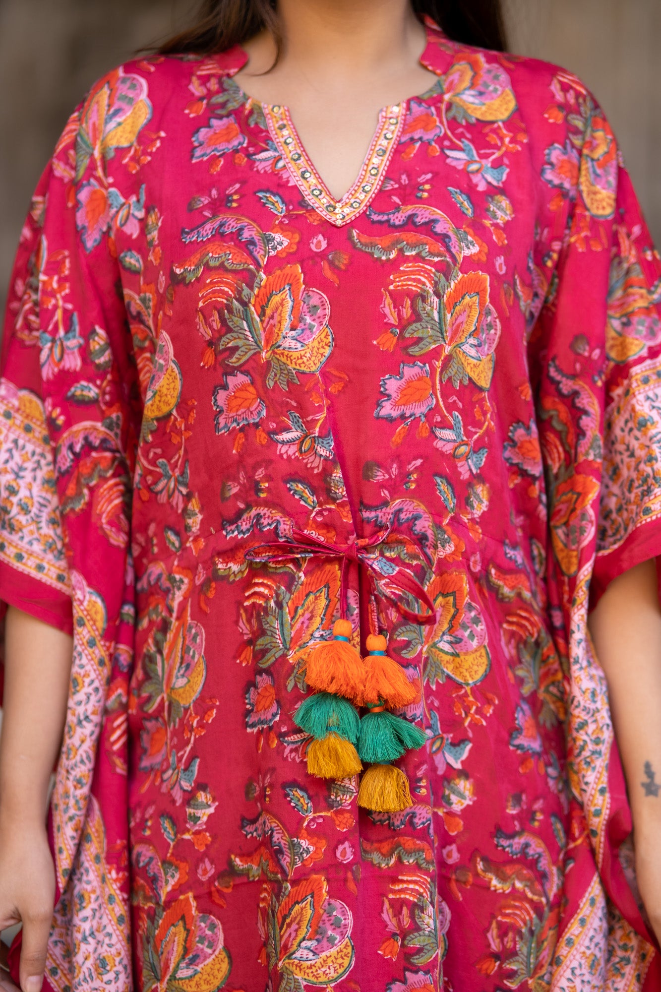 Style yourself with pink hand block printed floral kaftan with beautiful border and tassels. This multicolor kaftan has bordered V neck with a thin border.