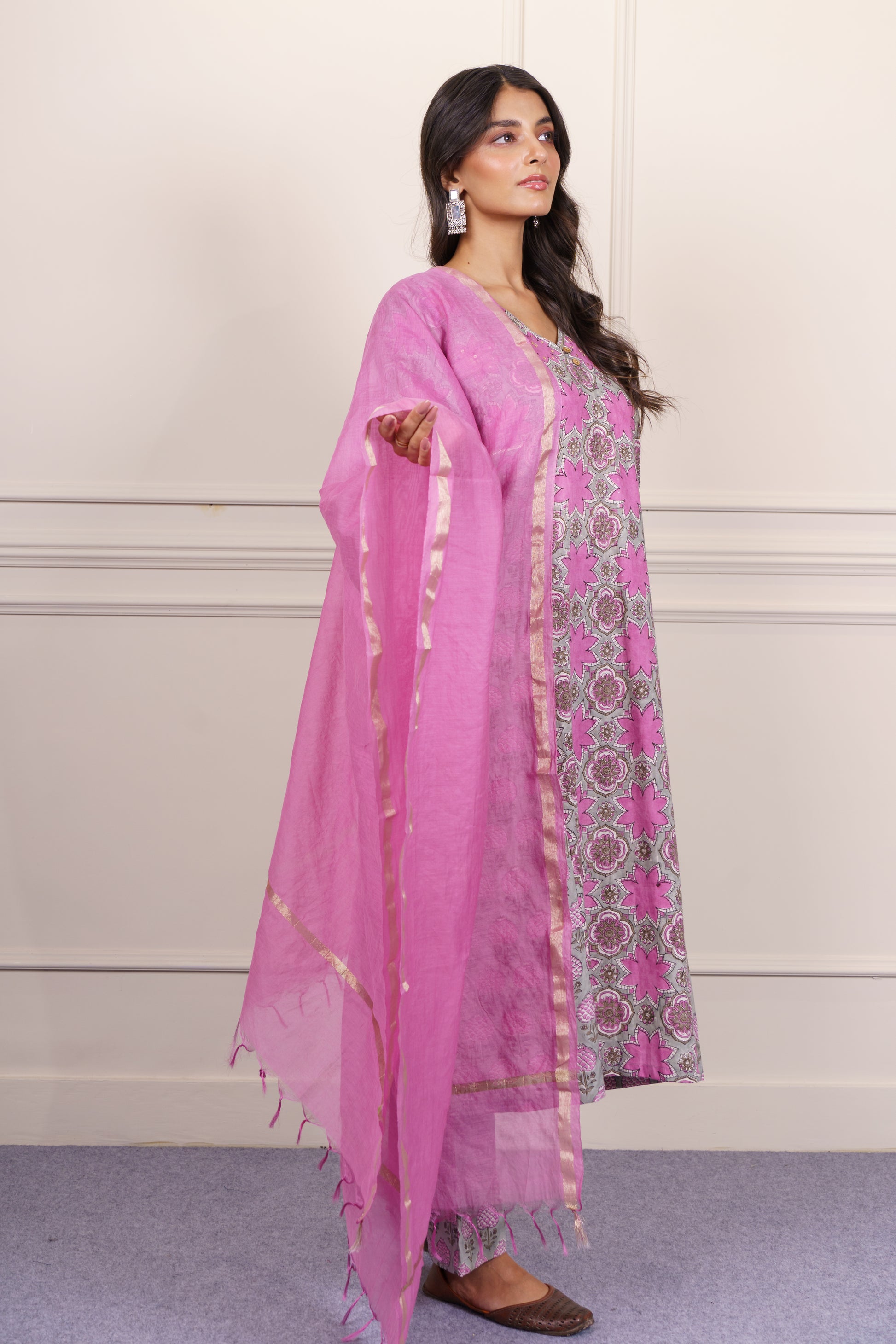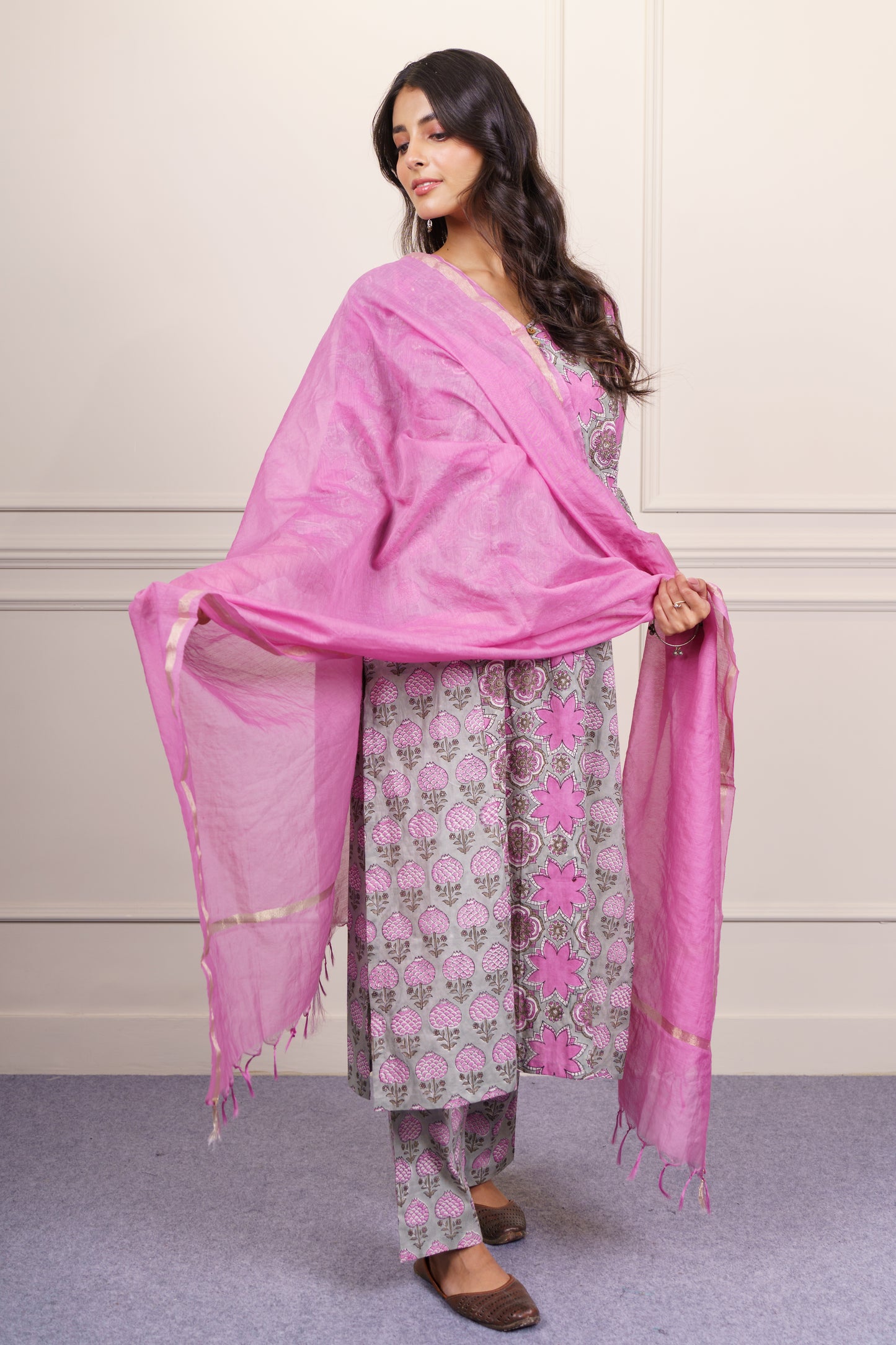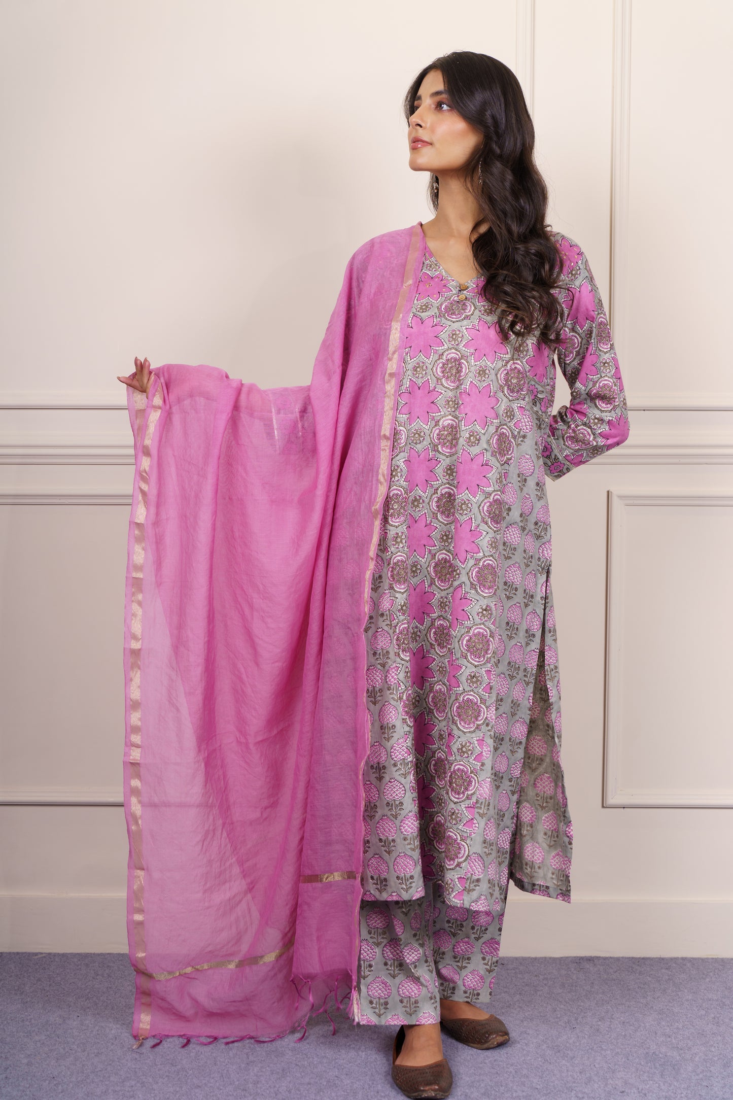 Add timeless charm to your wardrobe with this pink and grey floral hand Block Printed kurta Chanderi Dupatta set. The straight kurta features a graceful V-neckline and full sleeves, crafted in breathable cotton for all-day comfort. Paired with matching printed pants, this cotton kurta set blends elegance and tradition for a chic everyday look.