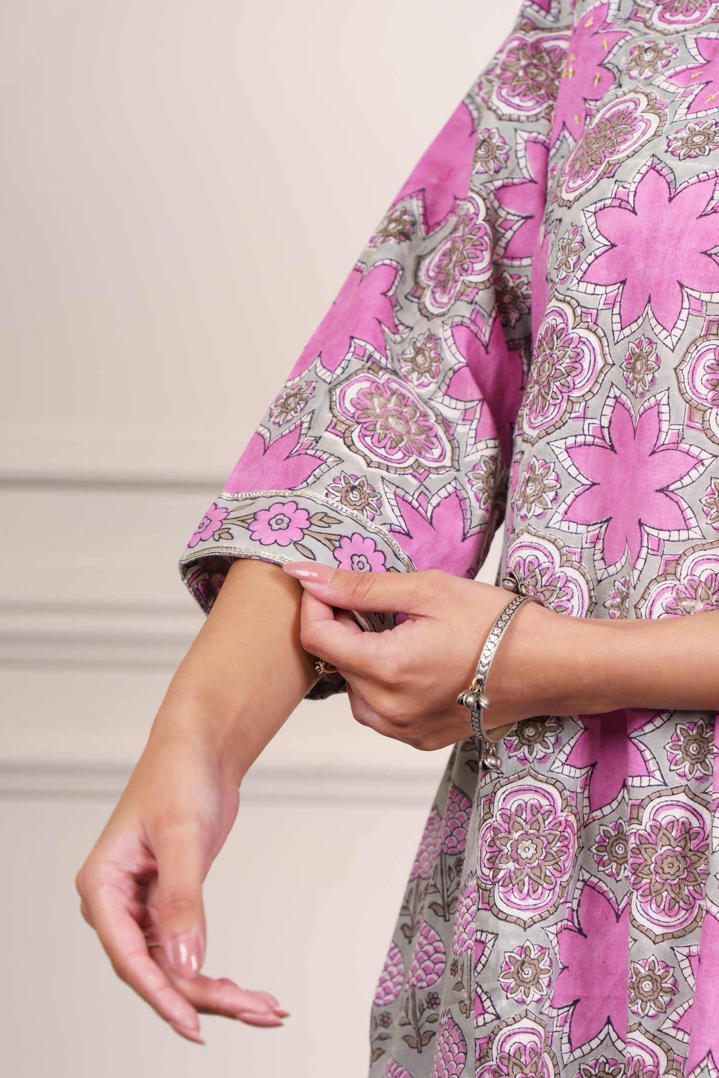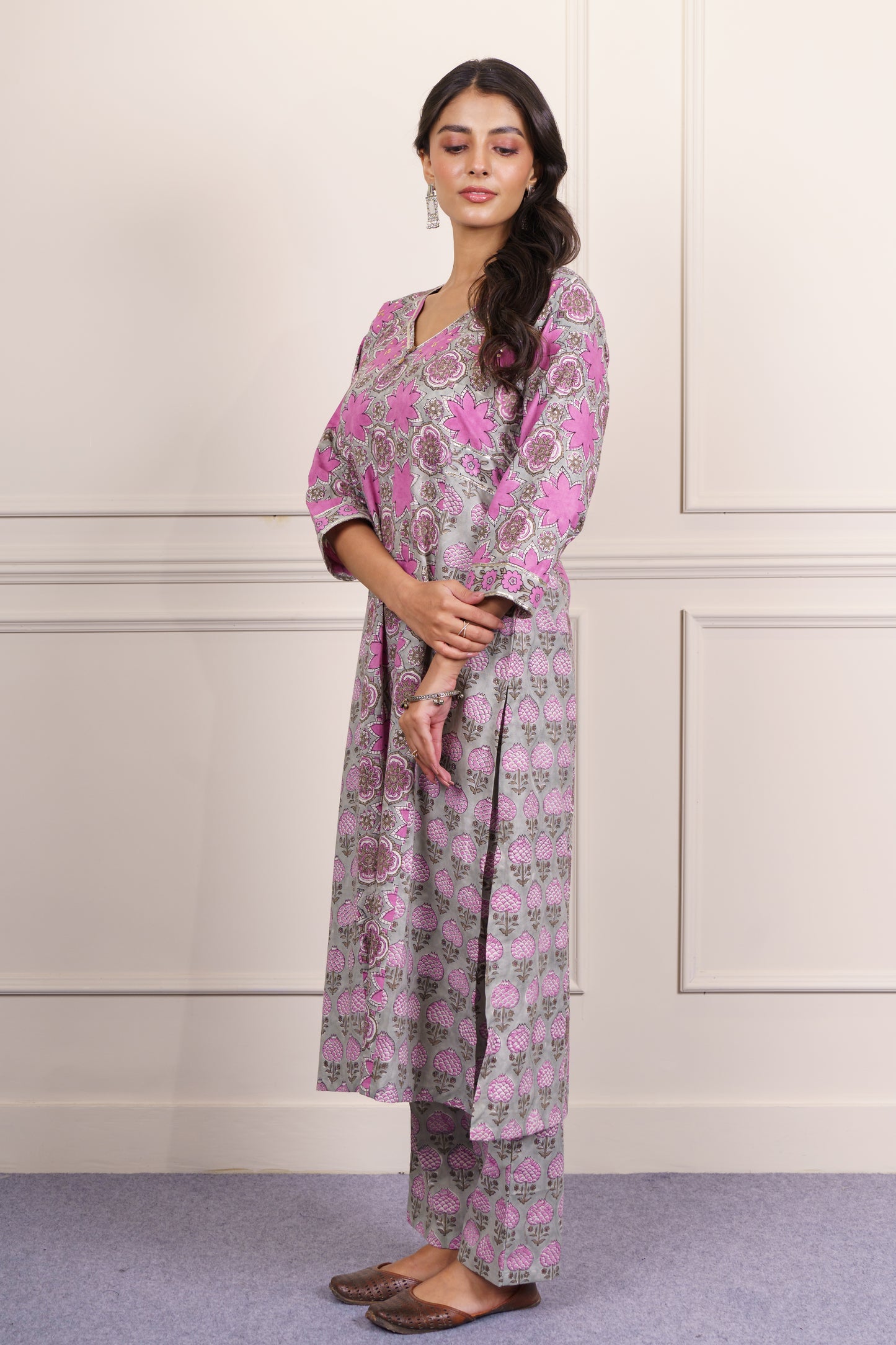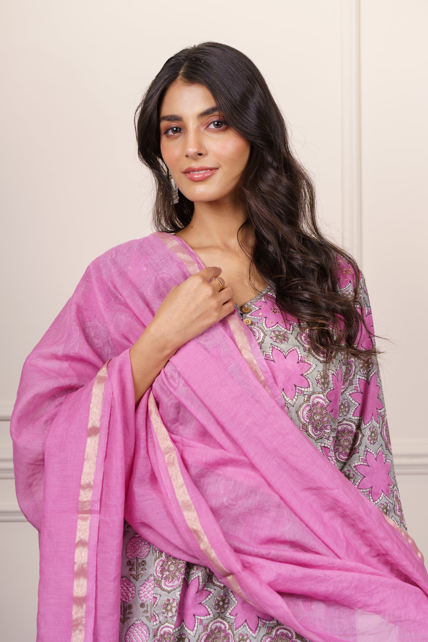 Add timeless charm to your wardrobe with this pink and grey floral hand Block Printed kurta Chanderi Dupatta set. The straight kurta features a graceful V-neckline and full sleeves, crafted in breathable cotton for all-day comfort. Paired with matching printed pants, this cotton kurta set blends elegance and tradition for a chic everyday look.