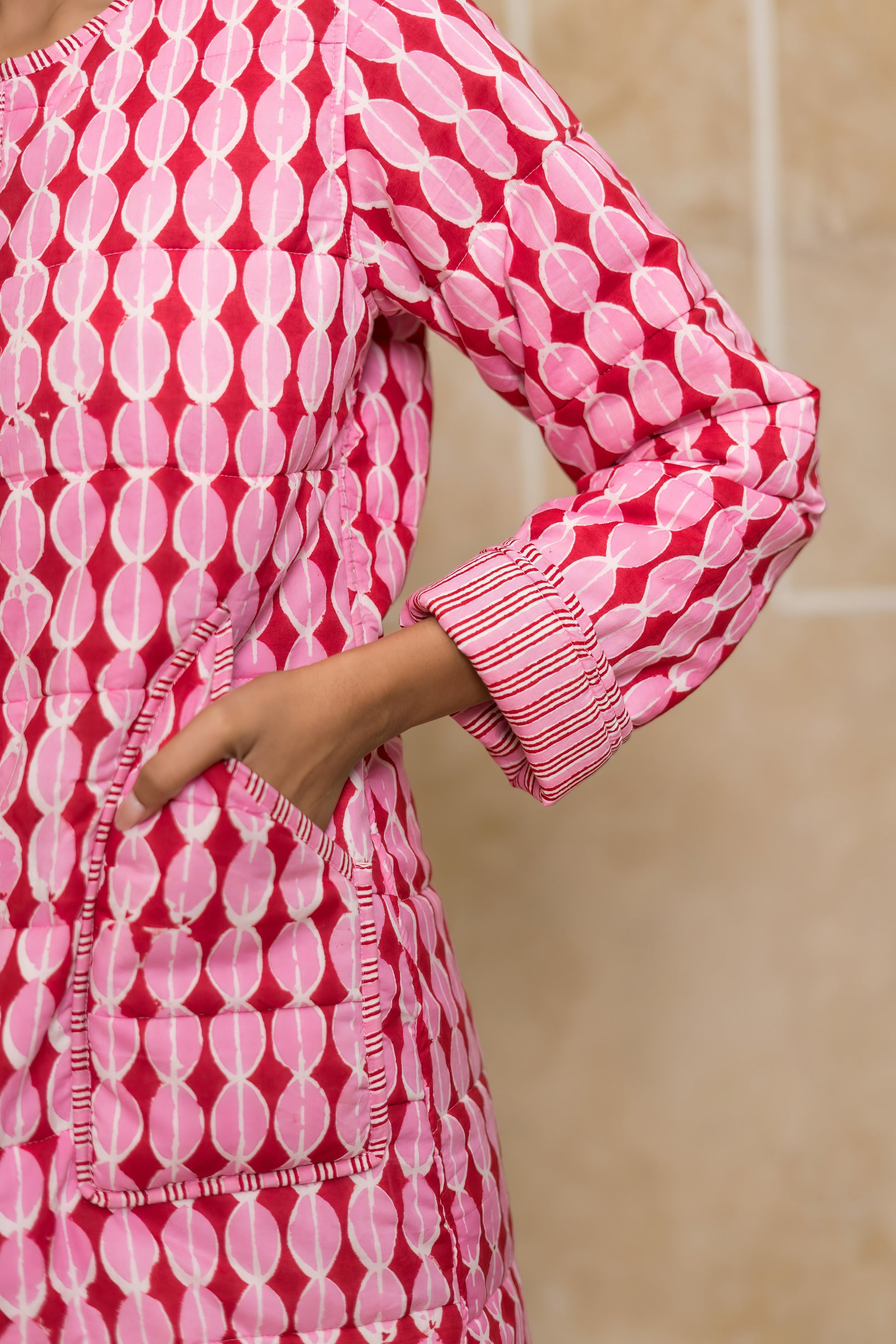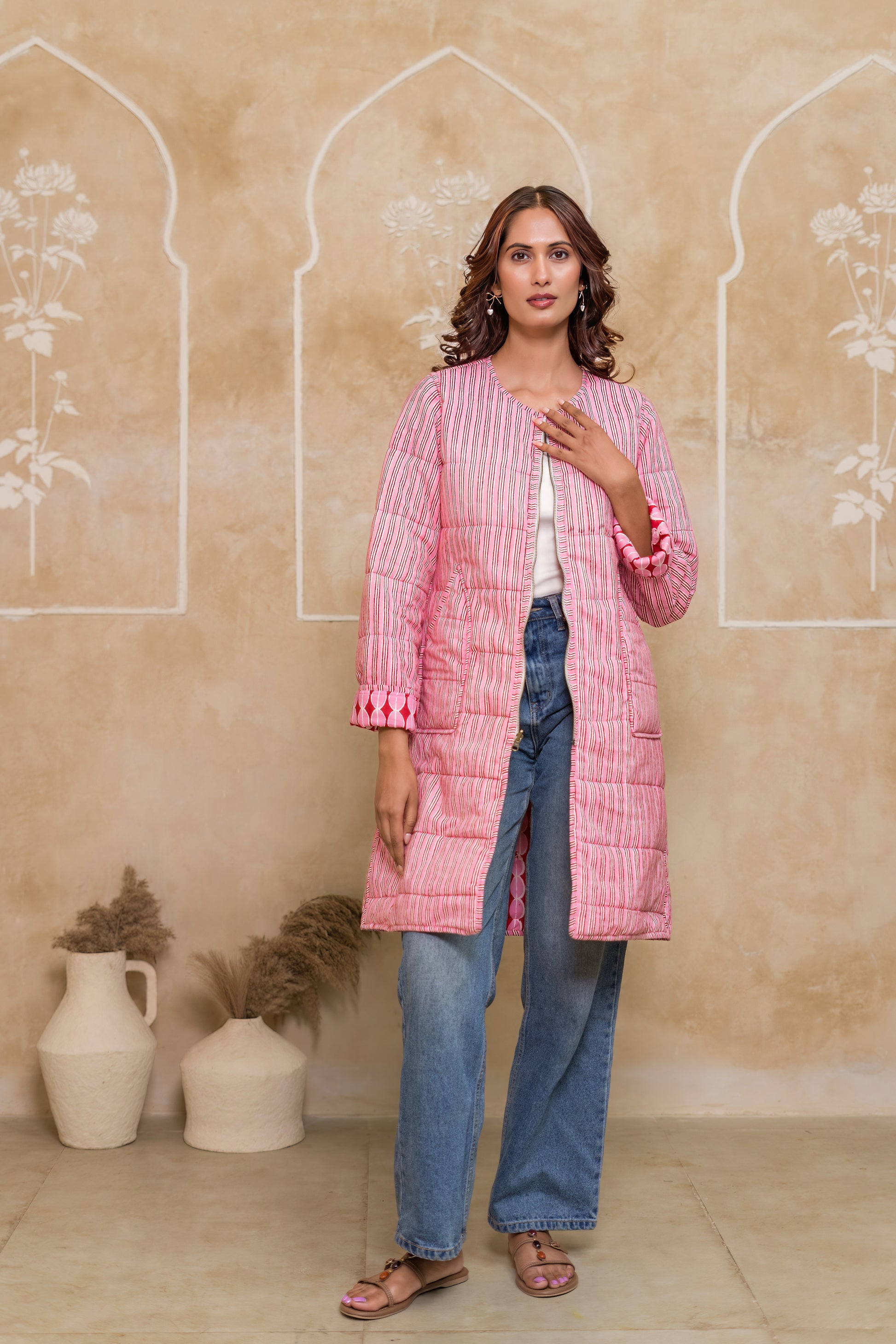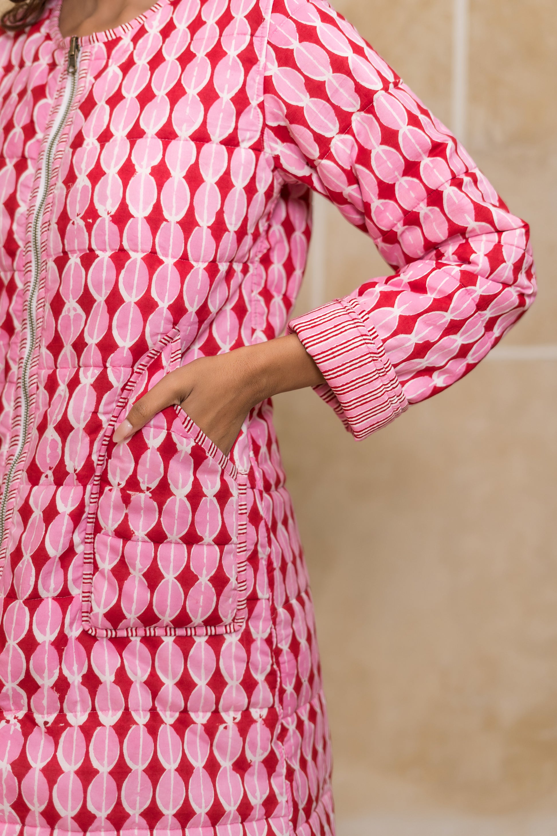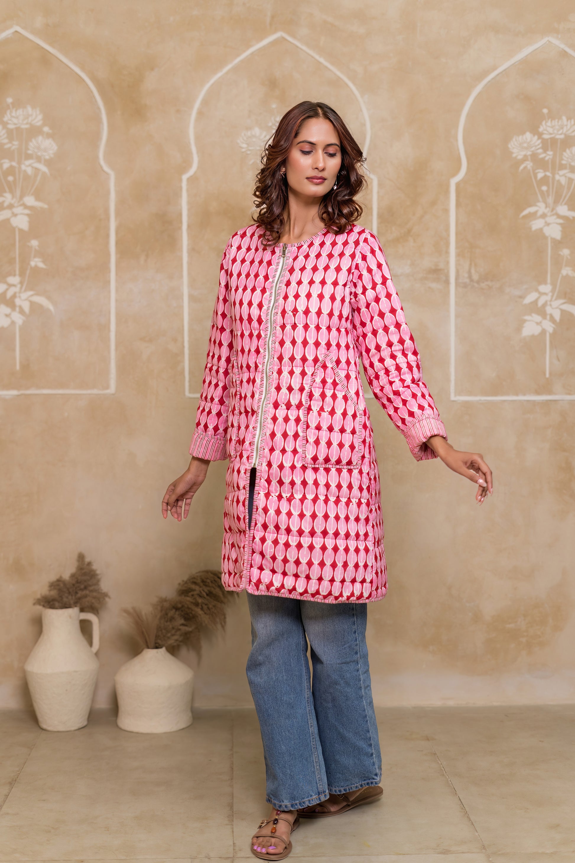 Beautiful hand block printed quilted coat with long sleeves that can be folded to add style to this winter outfit. The zipper closure coat has a printed fabric at the other side making it wearable from both the sides.