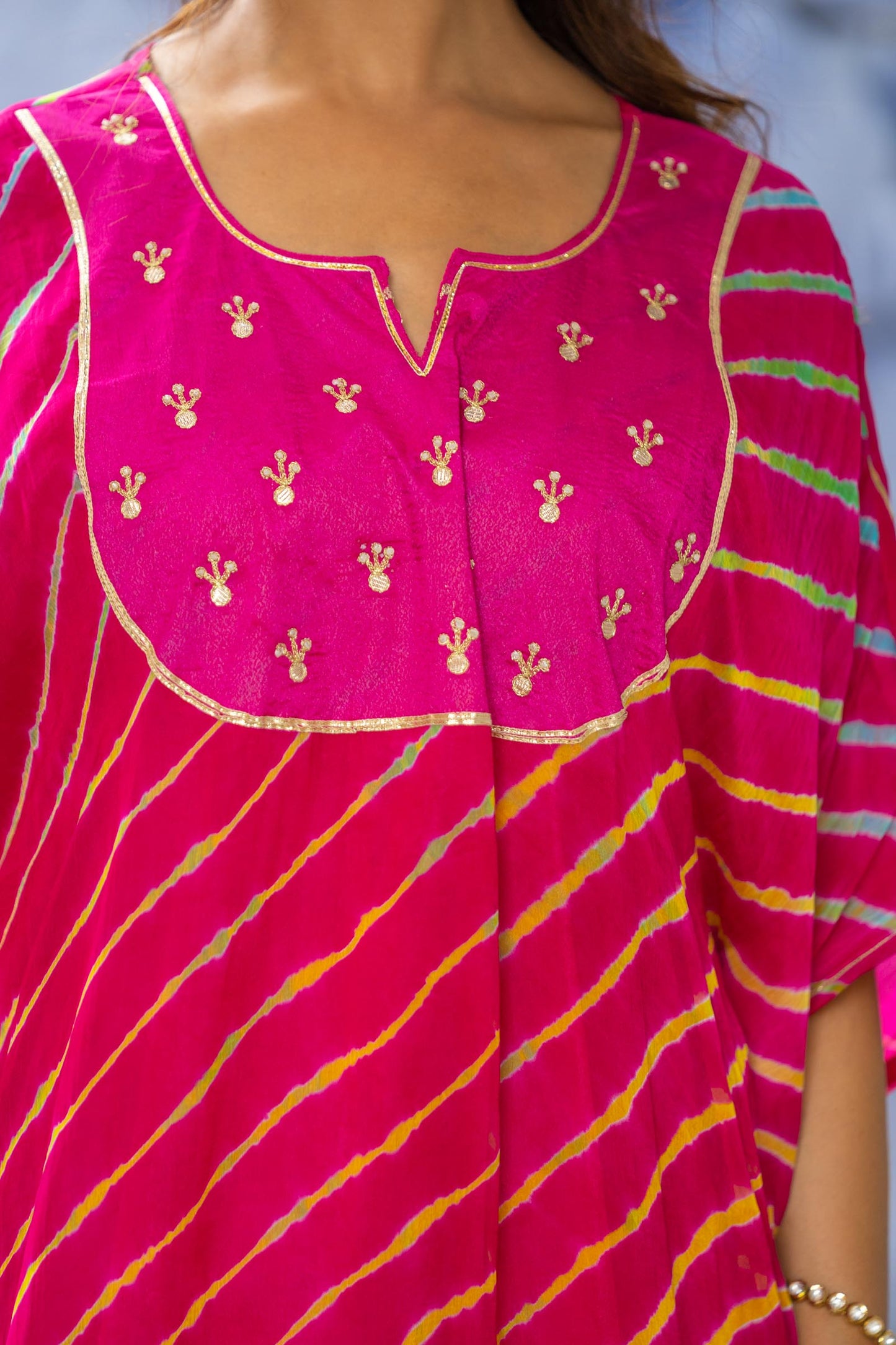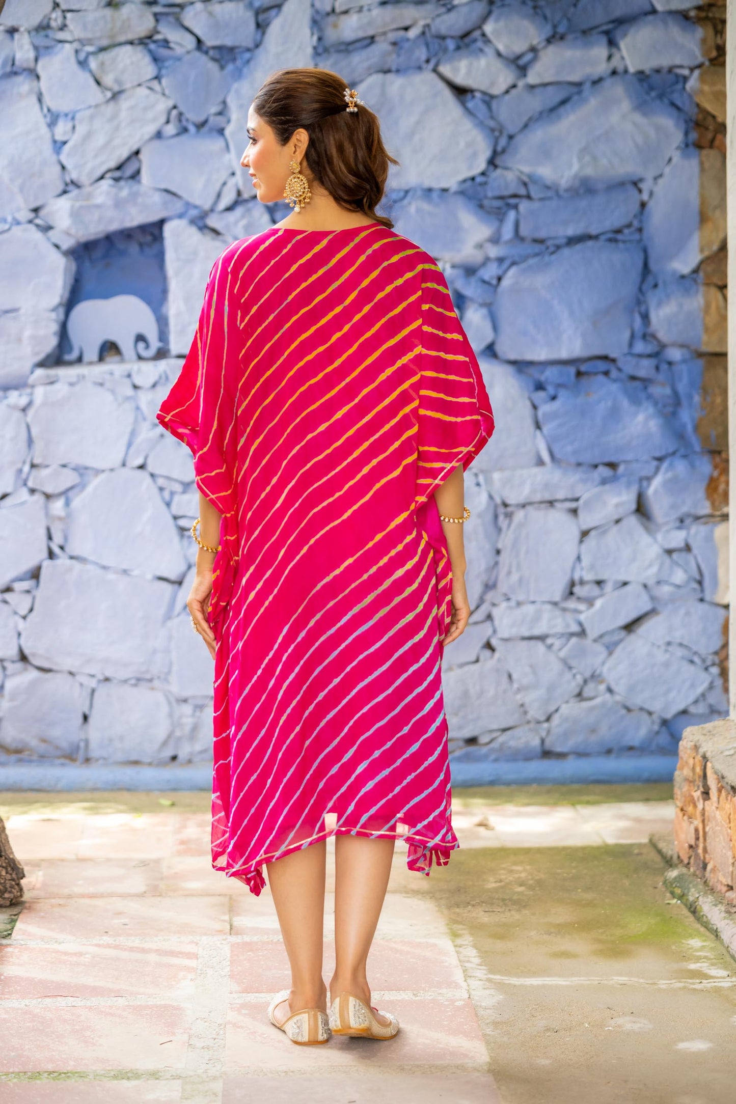 Style yourself in this bright pink lehariya kaftan dress in this festive season.