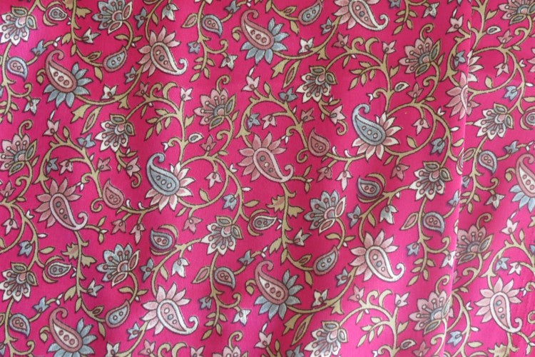 Wrinkle free polyester satin fabric for female outfits. Beautiful pink paisley pattern to suit all fashion style. .