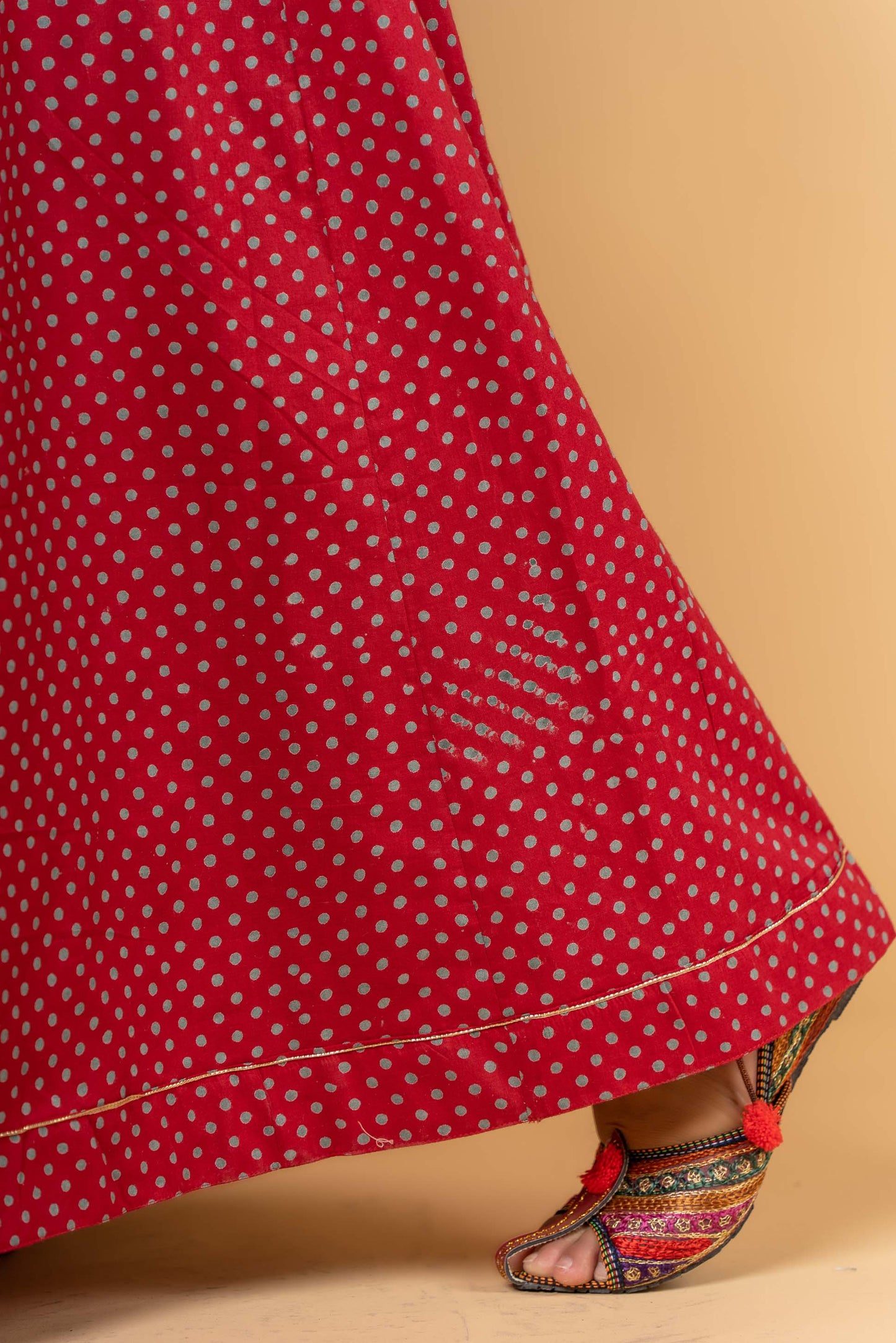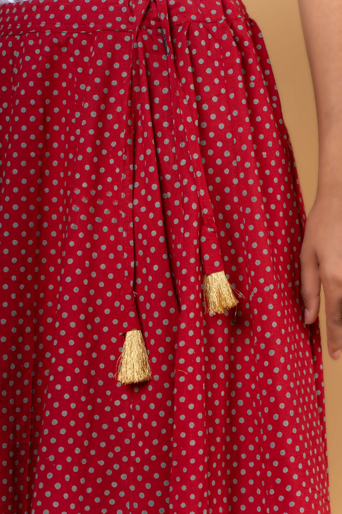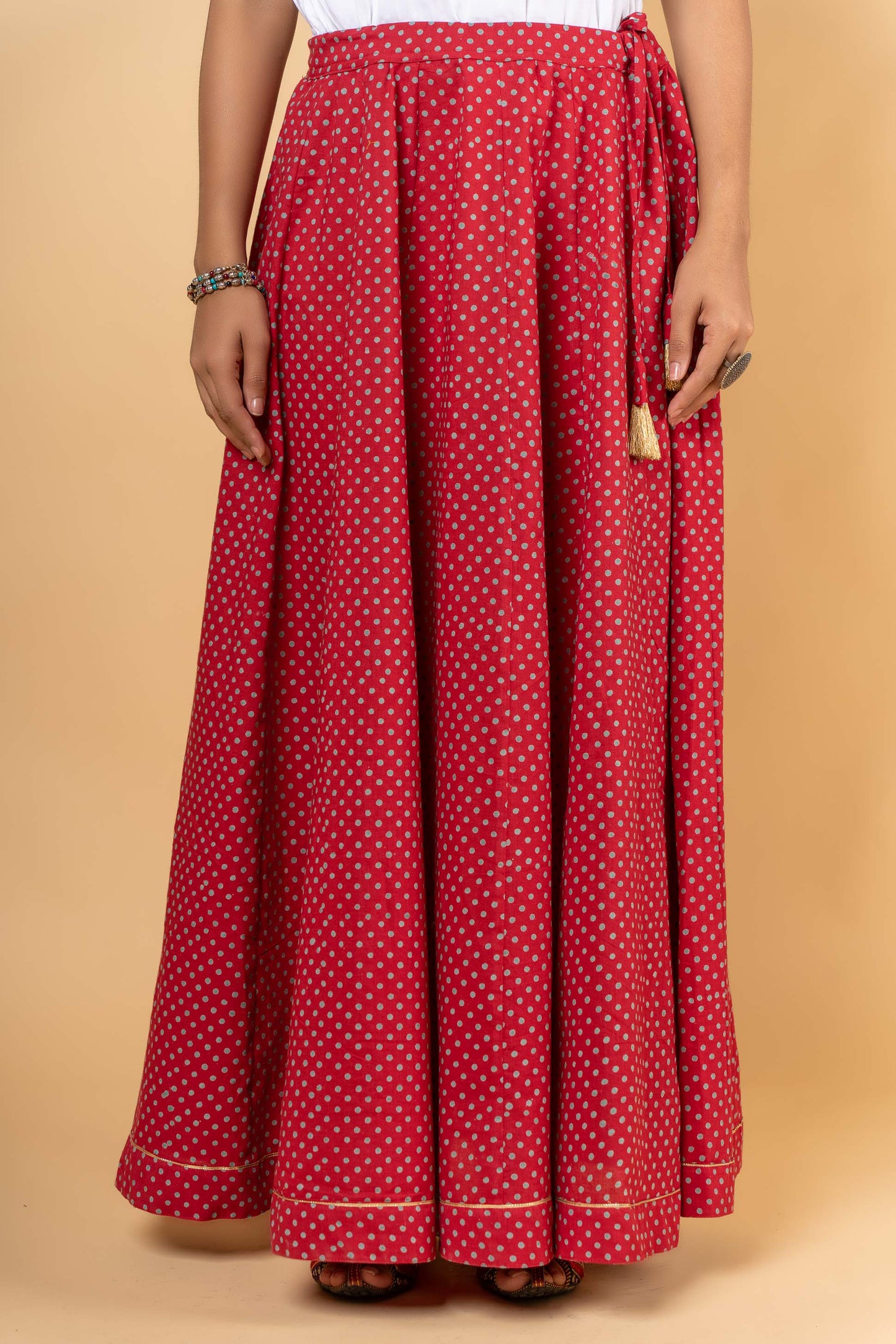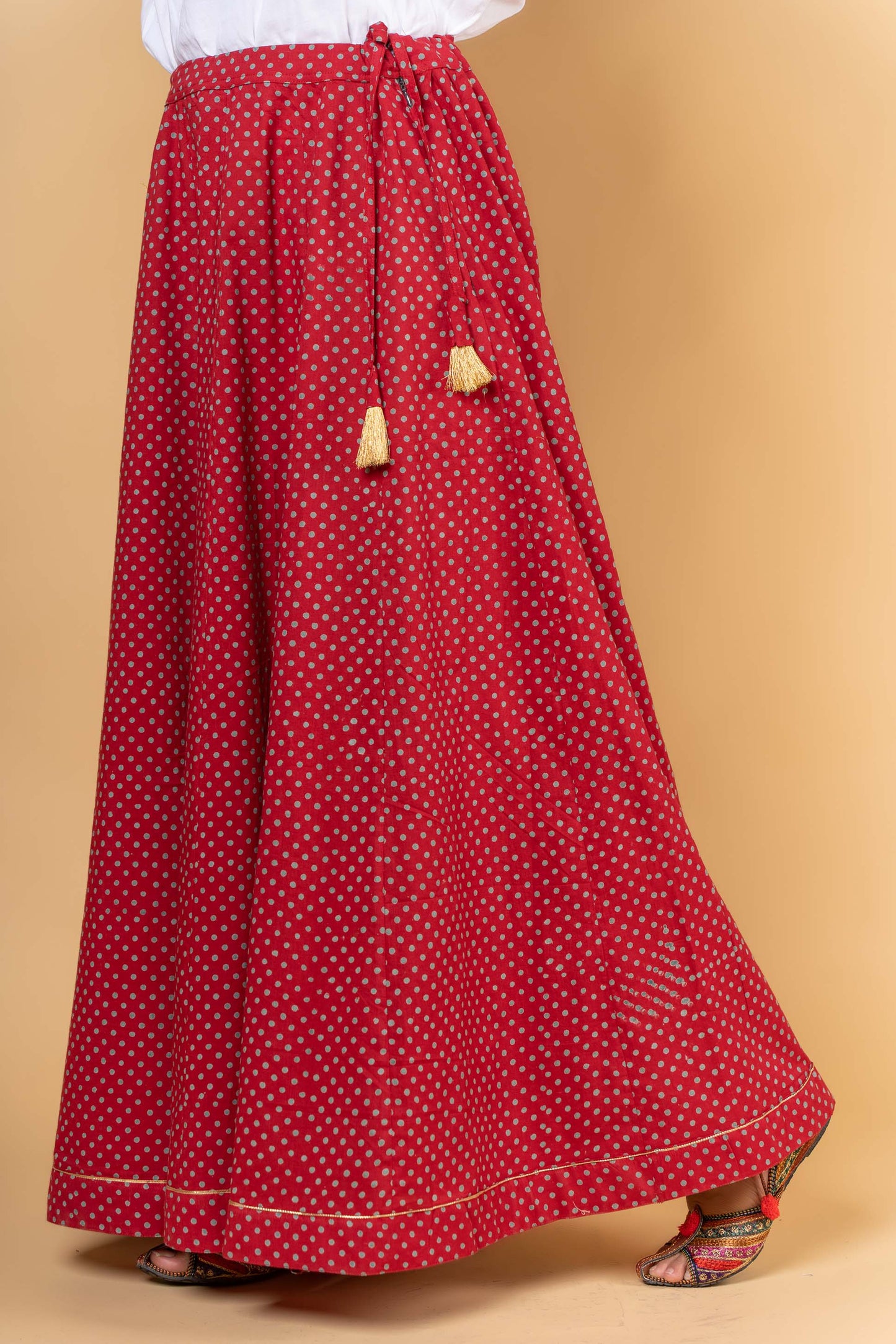 Style yourself with this pure cotton long and flaired skirt in plum red and turquoise color. This skirt has a gota detailing at the flair and zari tassels to enhance the look.