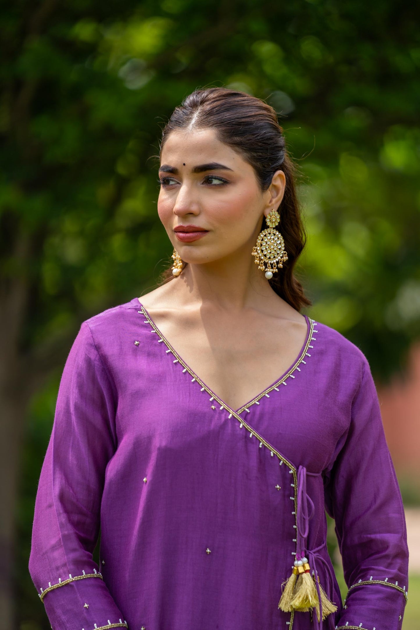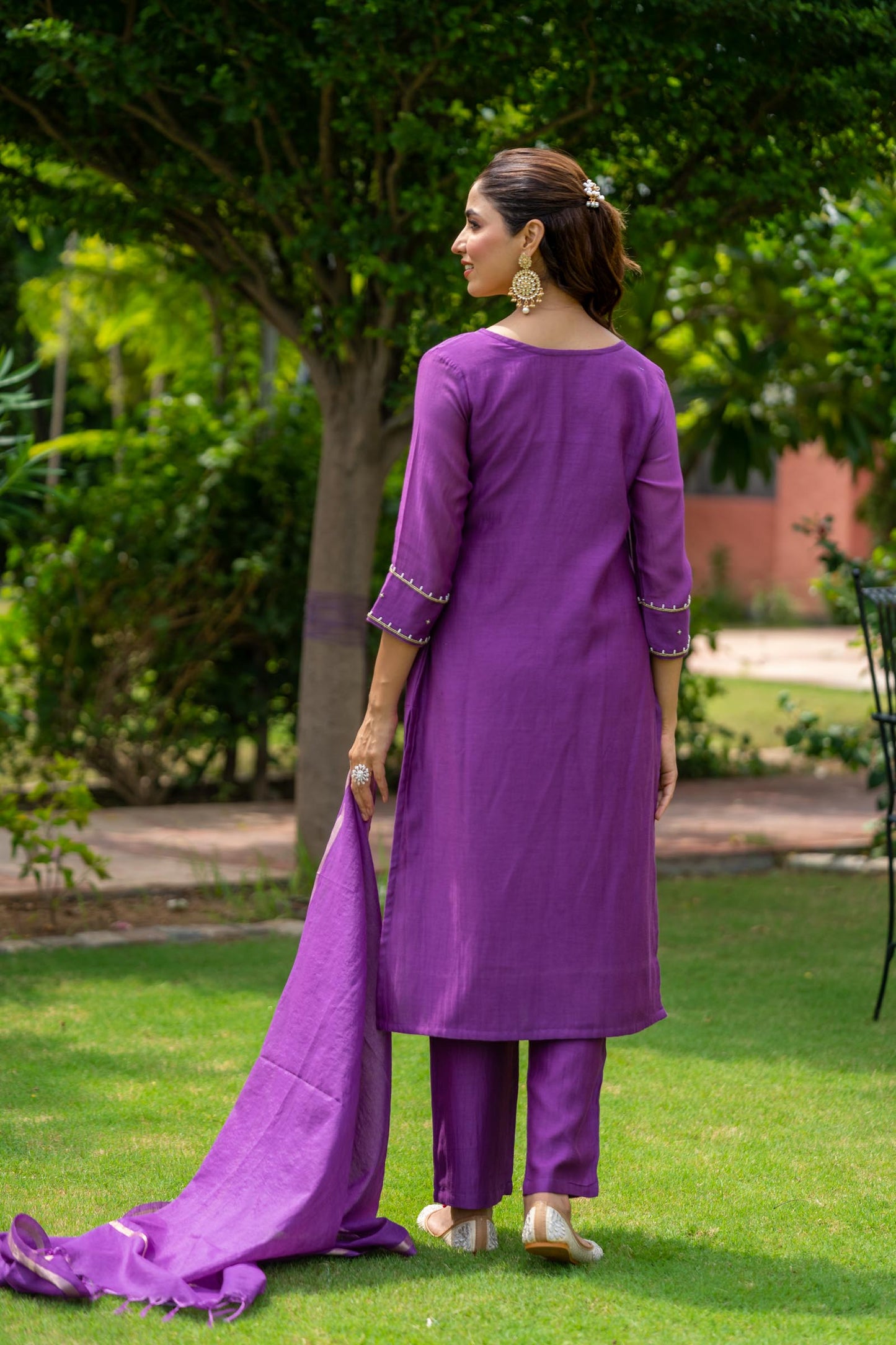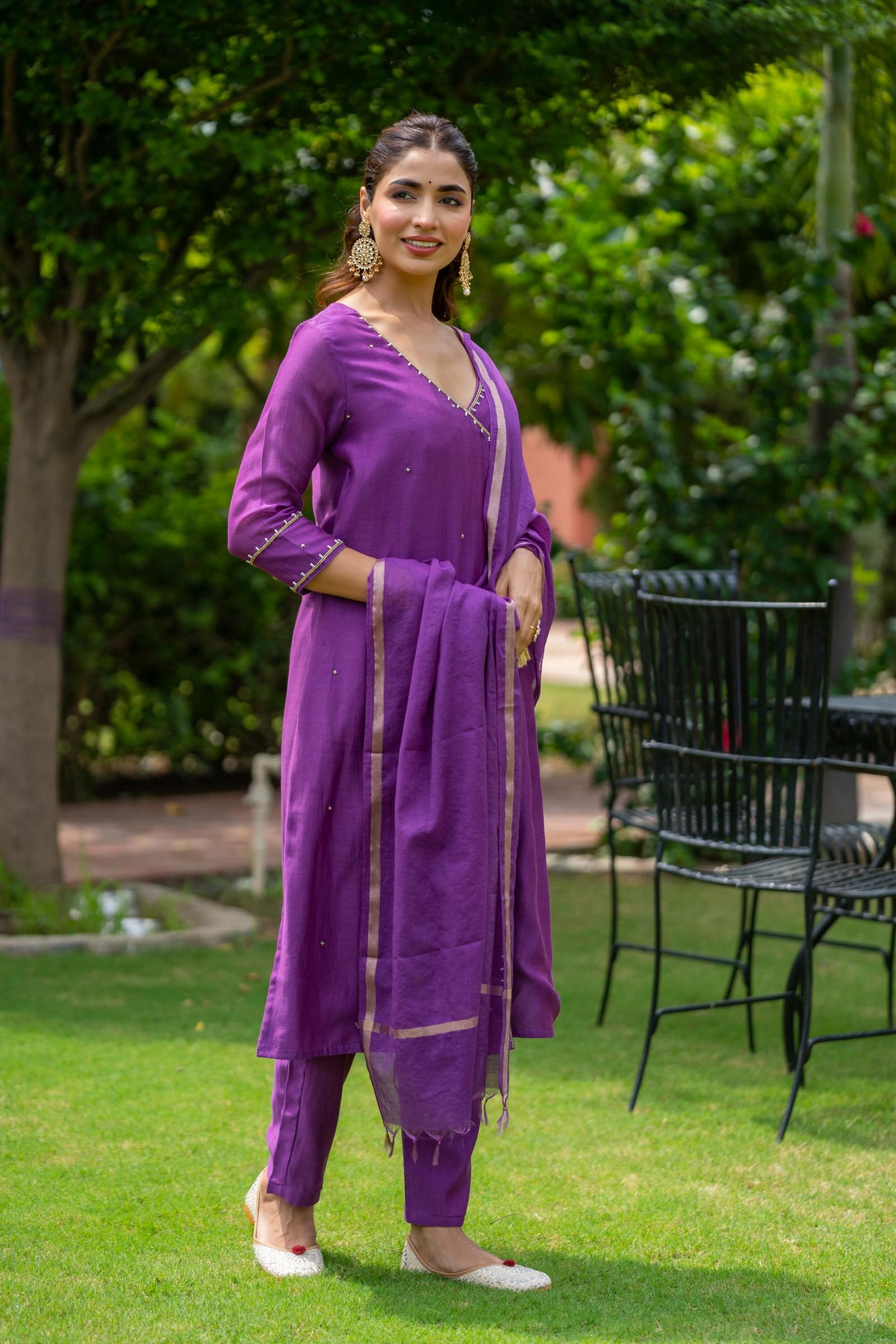 Style yourself in this bright purple chanderi fabric kurta pant dupatta set.