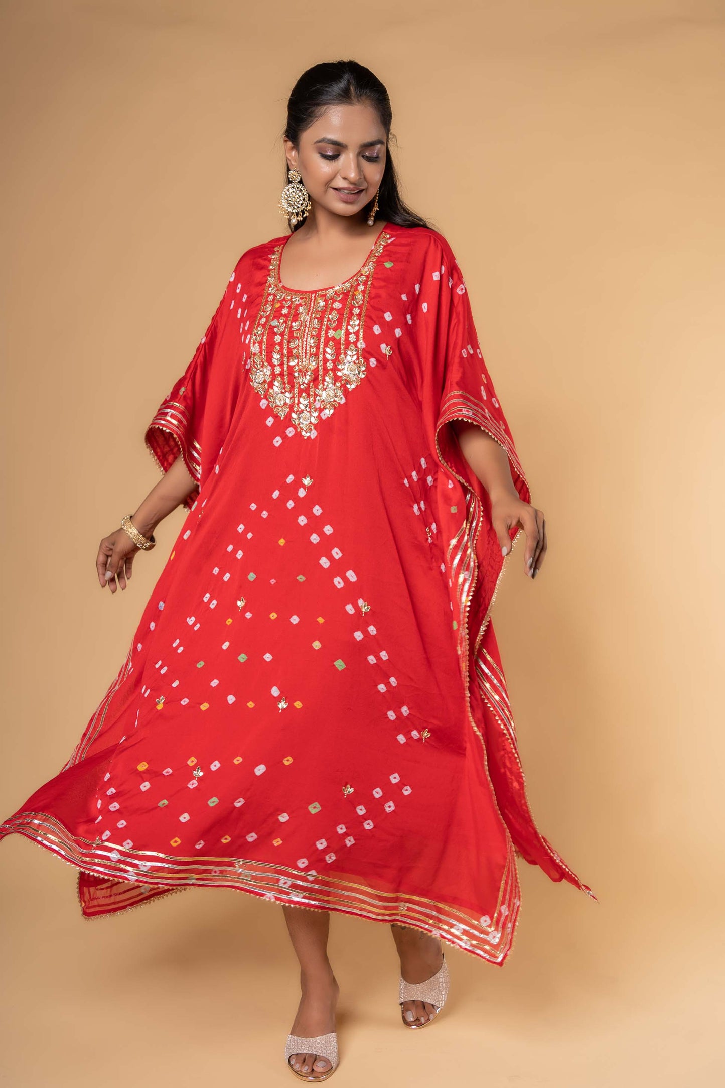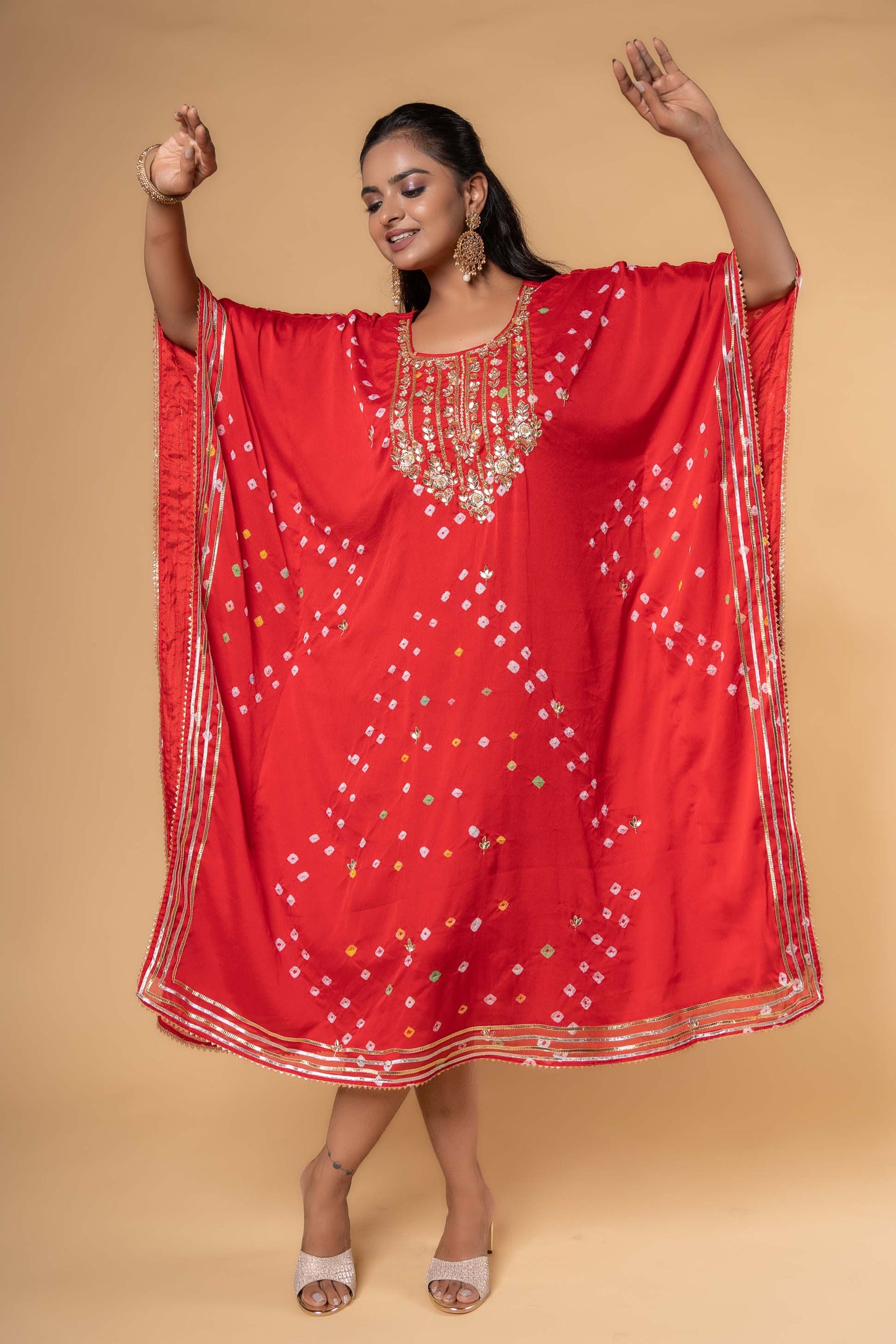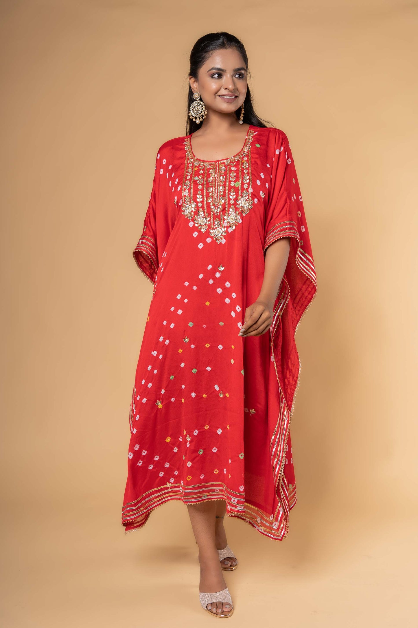 Style yourself with this hand work red badhejh / bandhini viscose crepe kaftan .