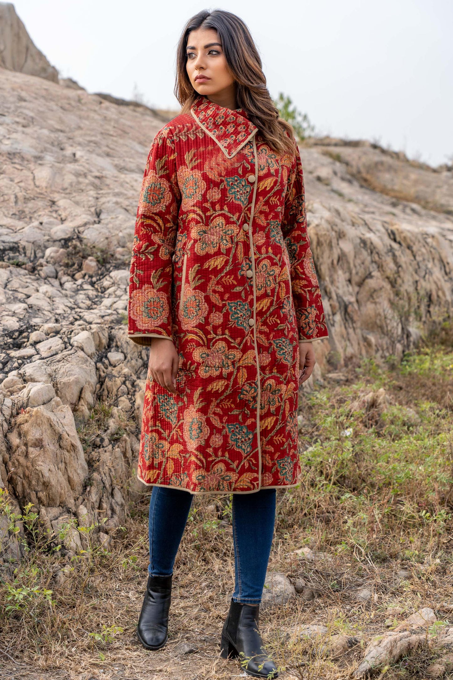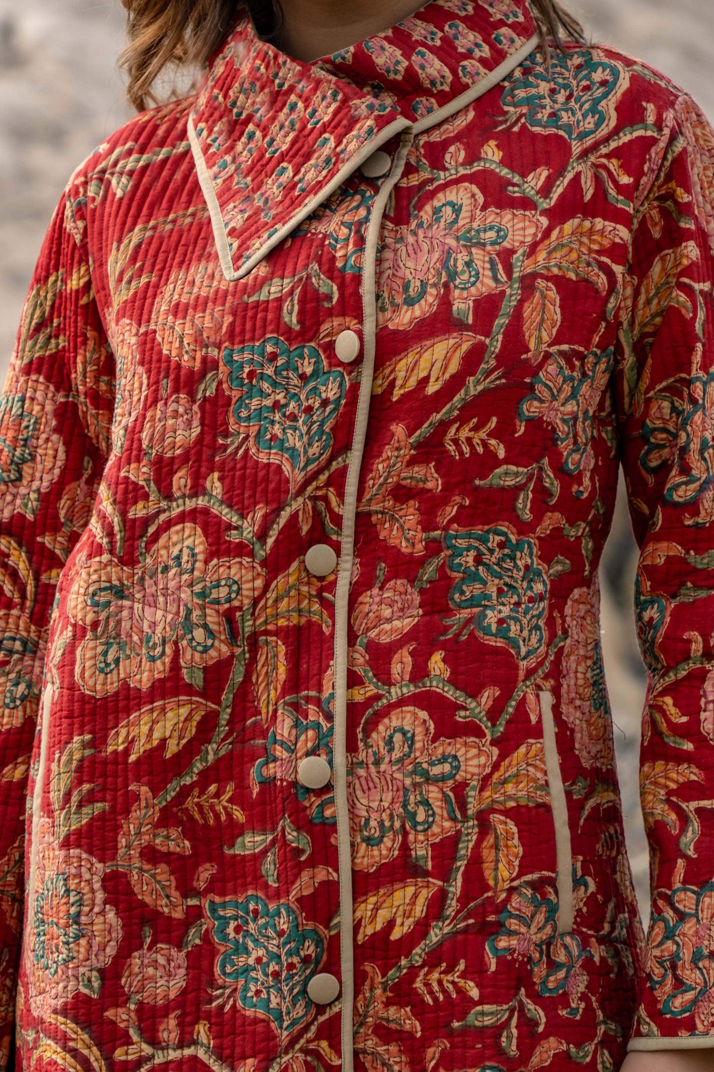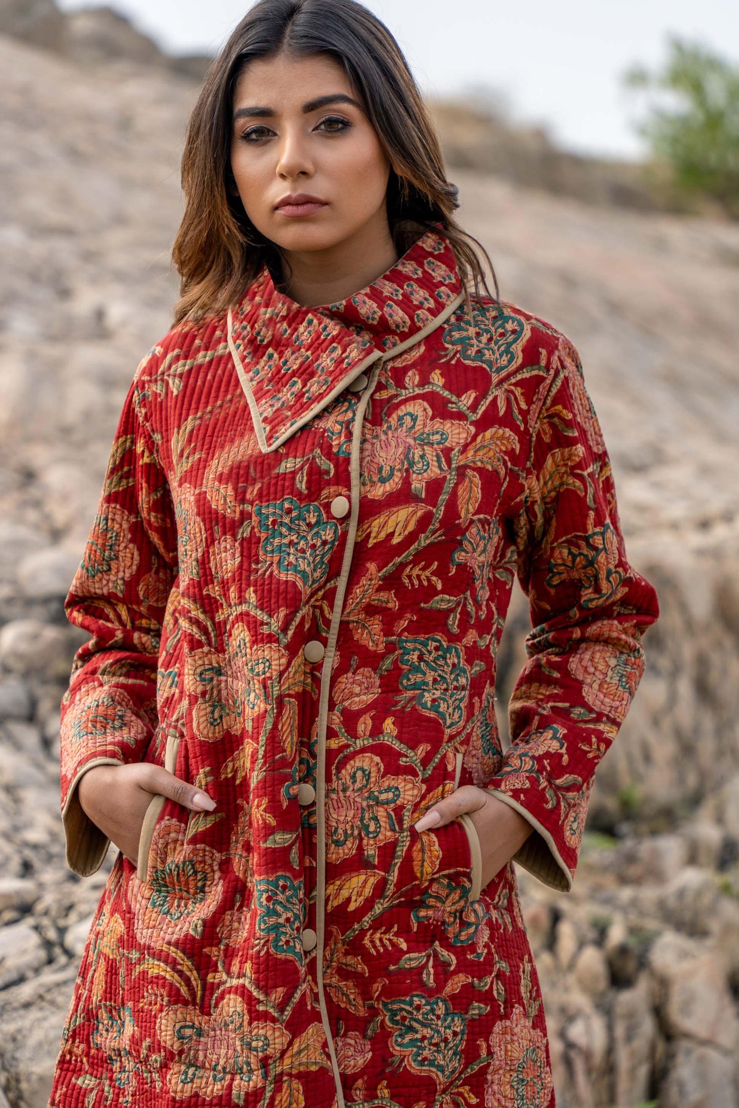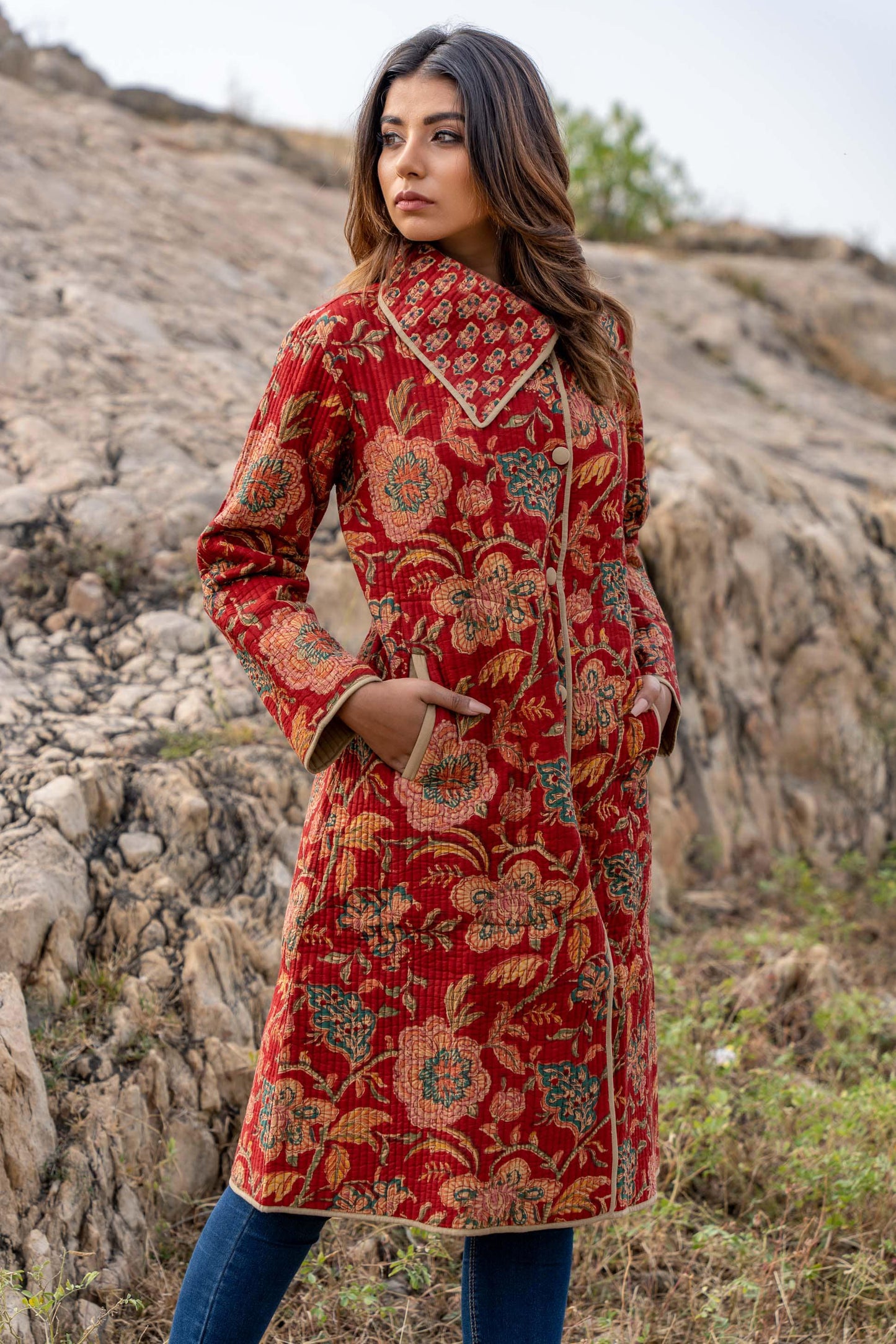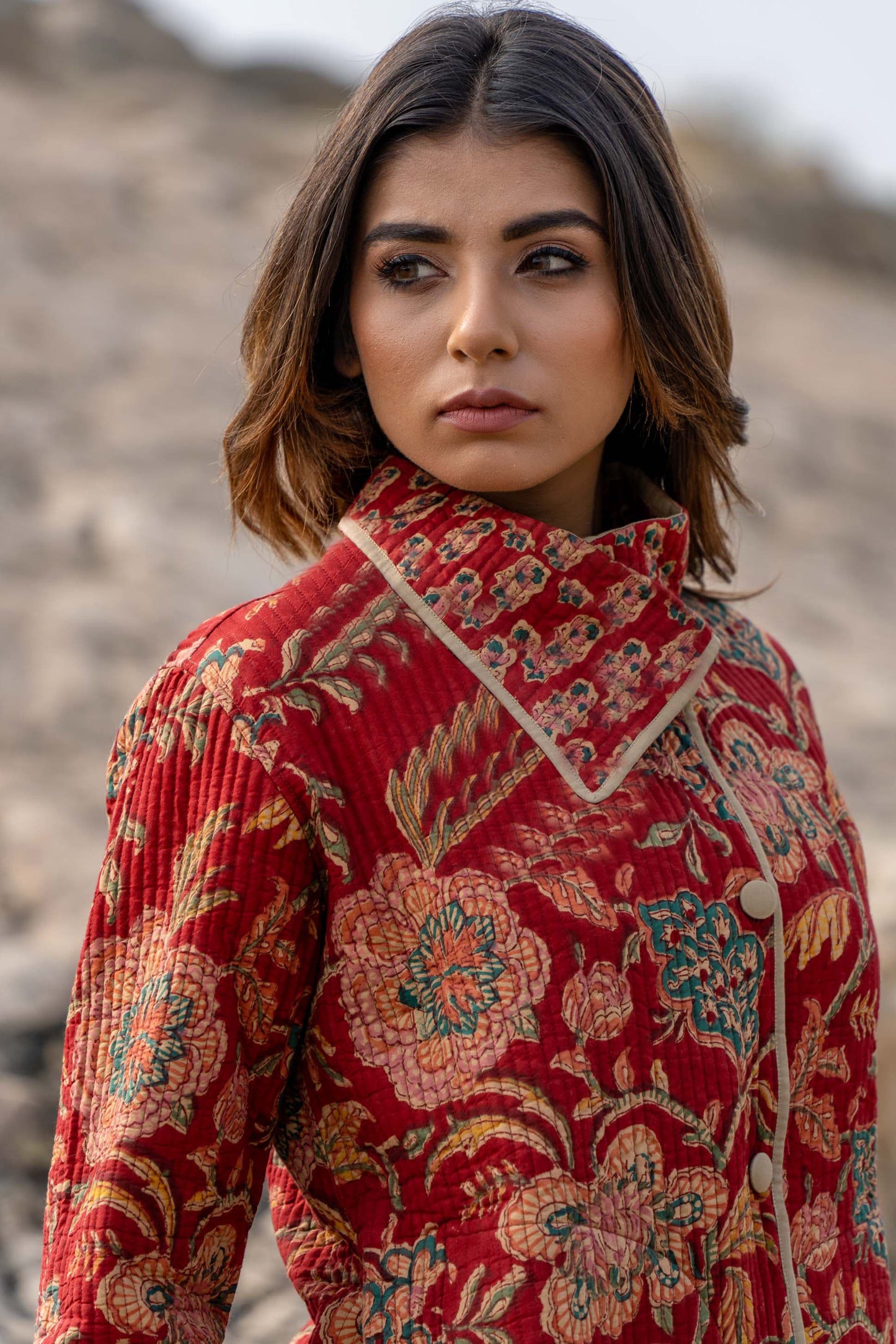 Red floral hand block printed bukhara coat as a perfect choice for this winter season.