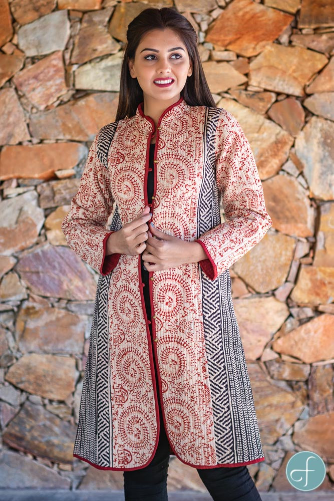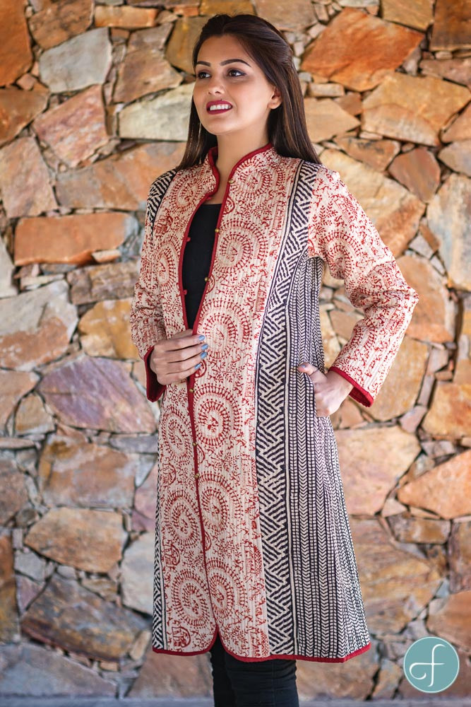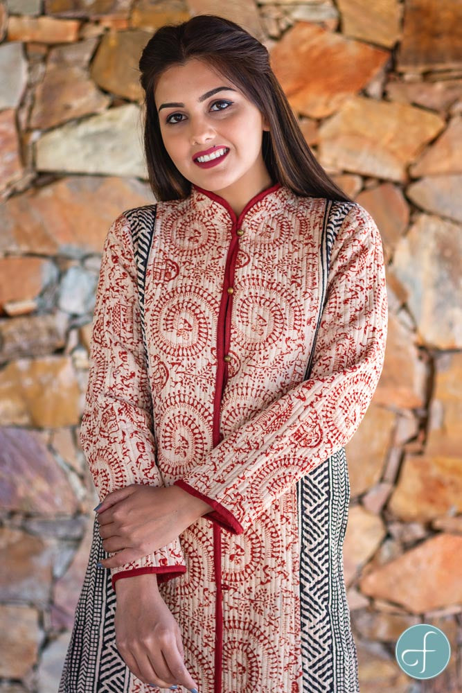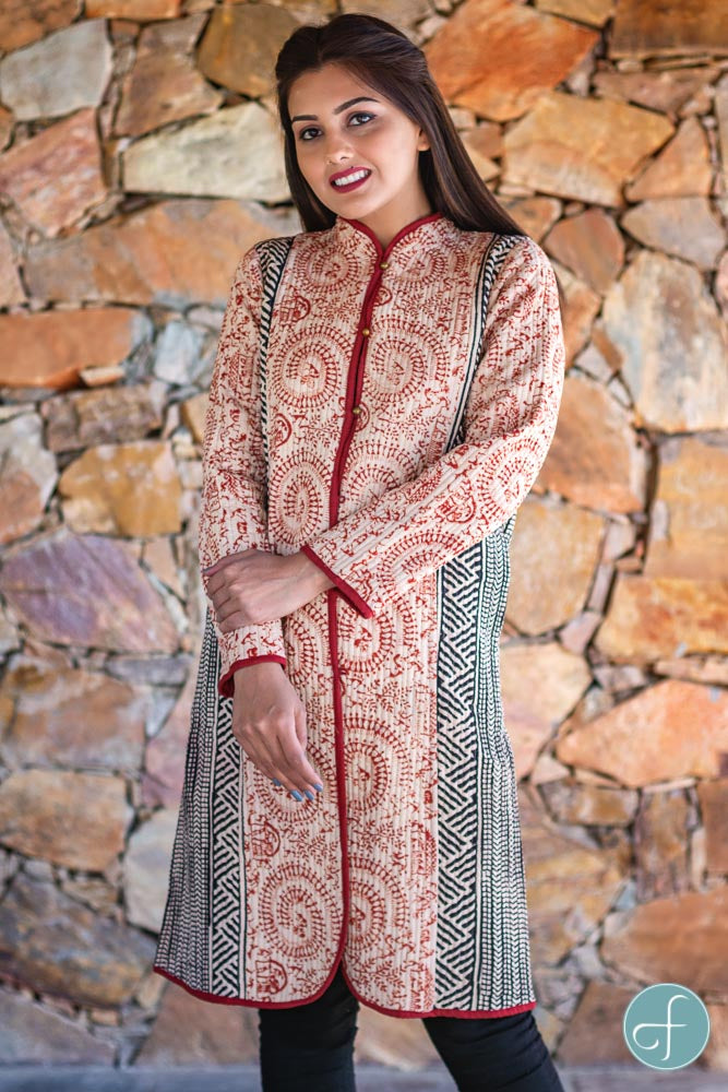 100% Cotton bagru red warli hand block printed reversible coat for women.
