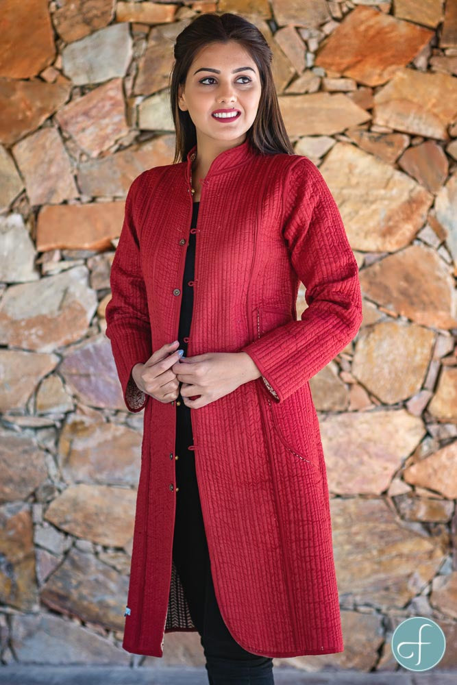 The jacket has beige and red color hand block printed fabric on front side and plain fabric on the other side.The coat can be worn from both the sides with front pockets.