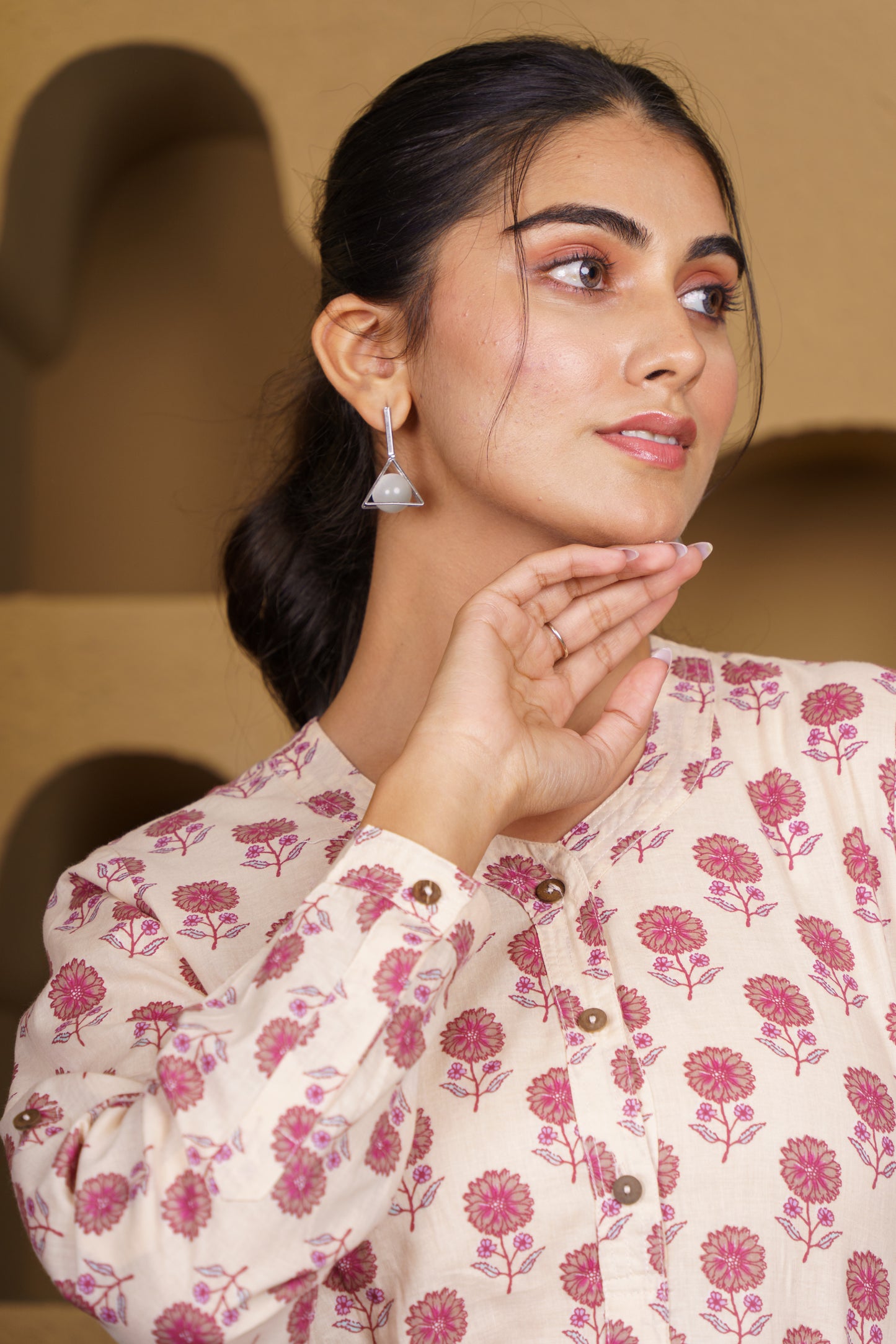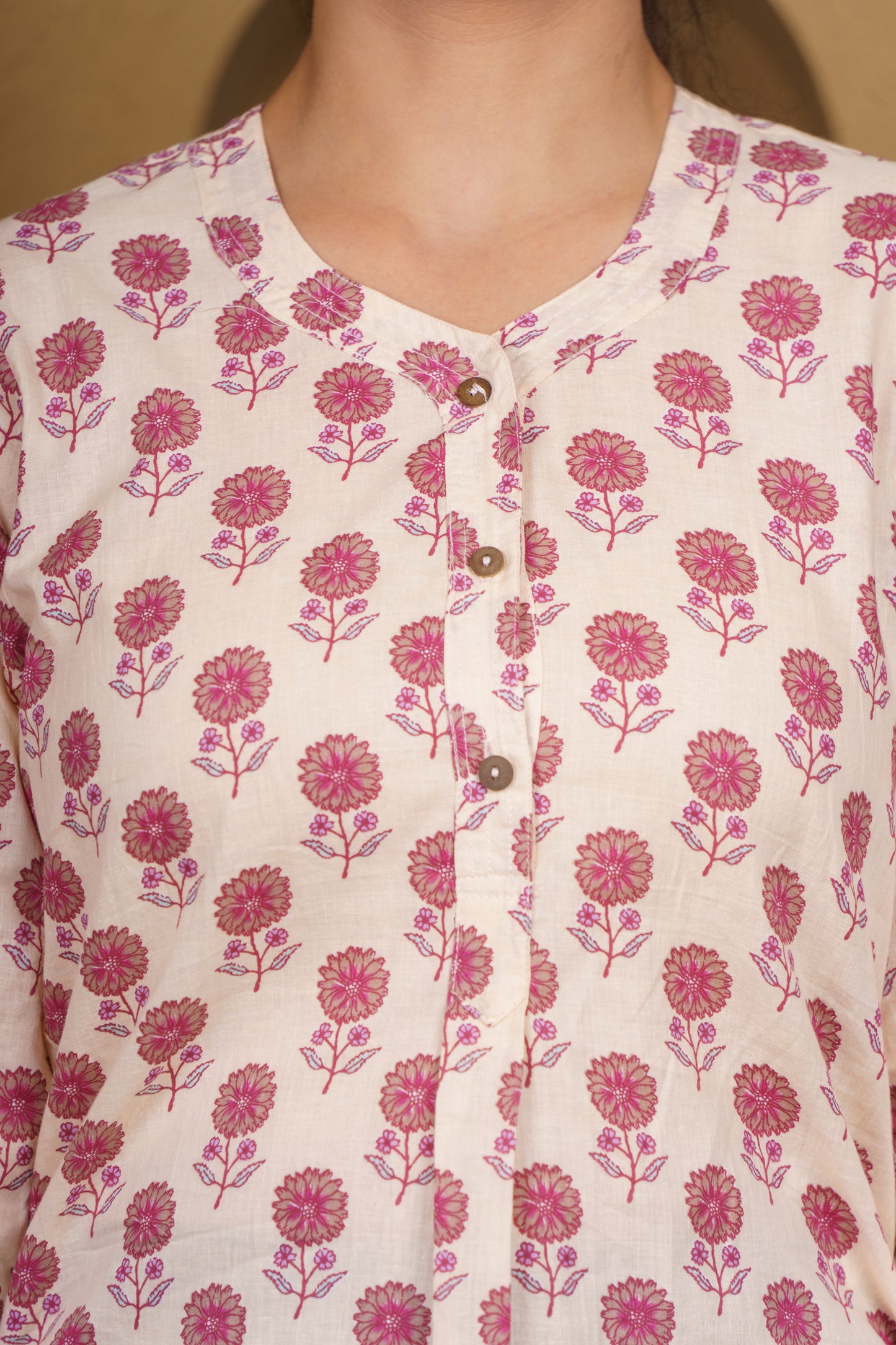 Elevate your everyday look with this off-white cotton kurti top featuring charming pink floral prints. Designed with a round neckline, front buttons, and full sleeves, this breathable cotton piece offers comfort and style in equal measure perfect for casual wear or relaxed outings.