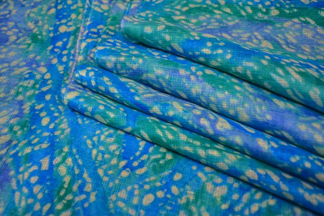 Kota doria printed fabric by the yard for all fashion lovers.Shades of blue,green with abstract print all over the fabric. The fabric is light weight and slightly sheer.