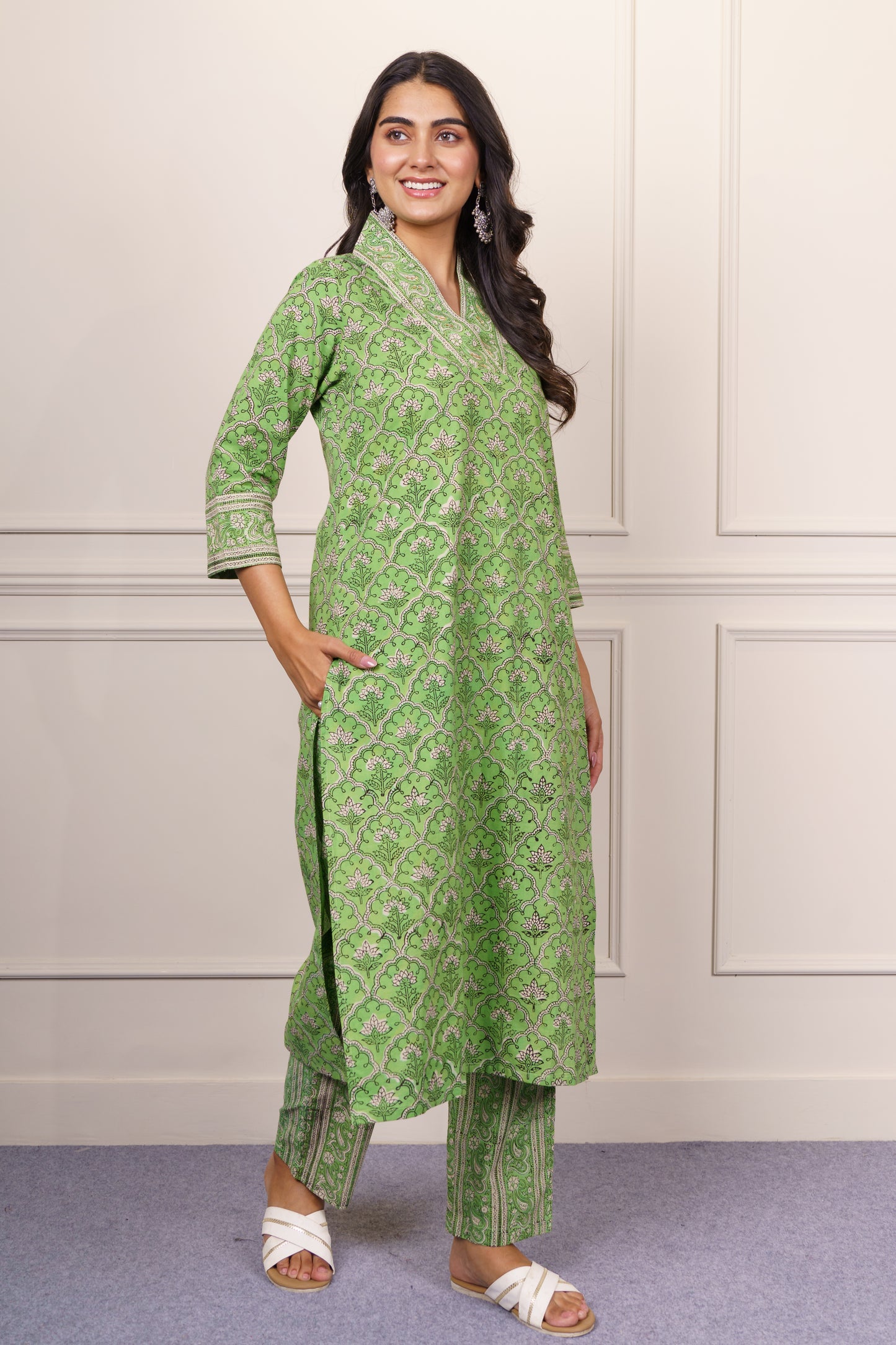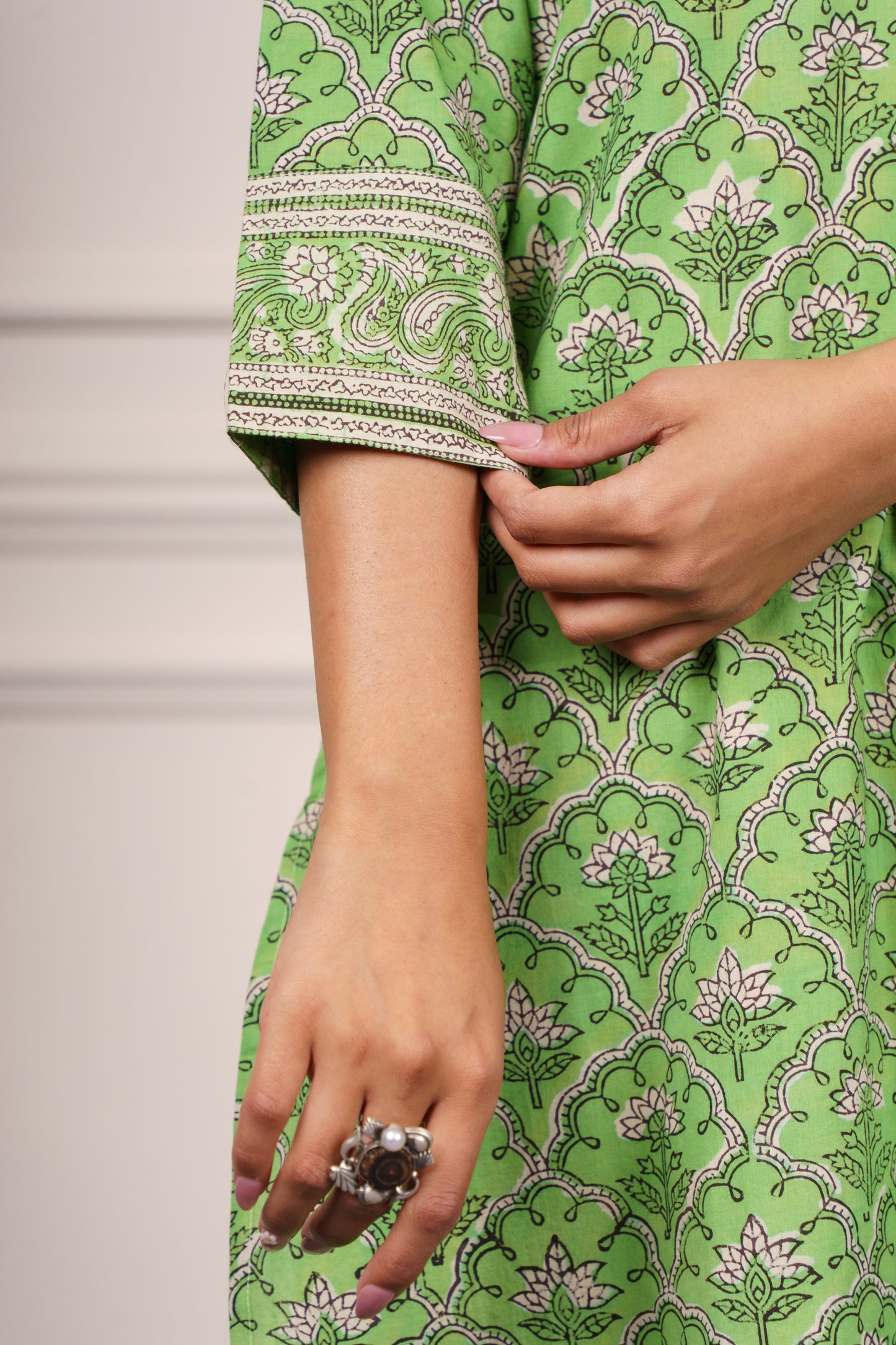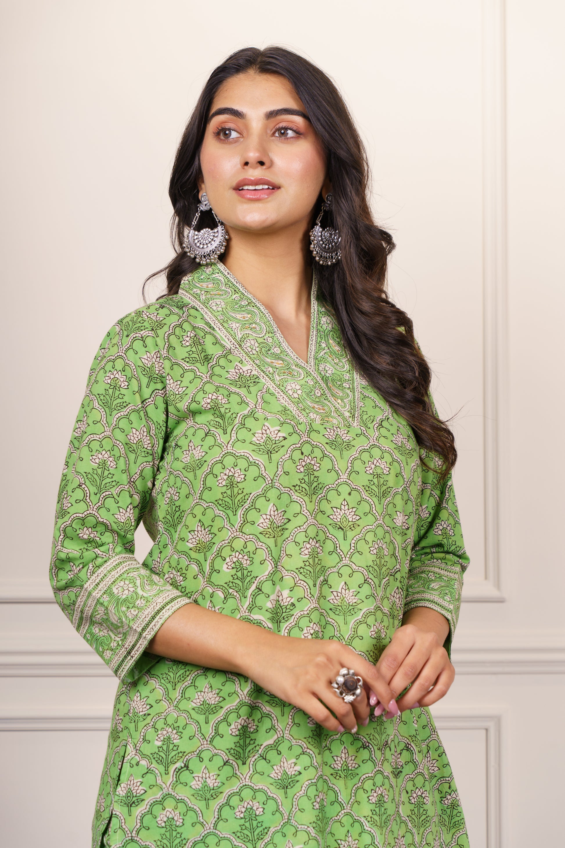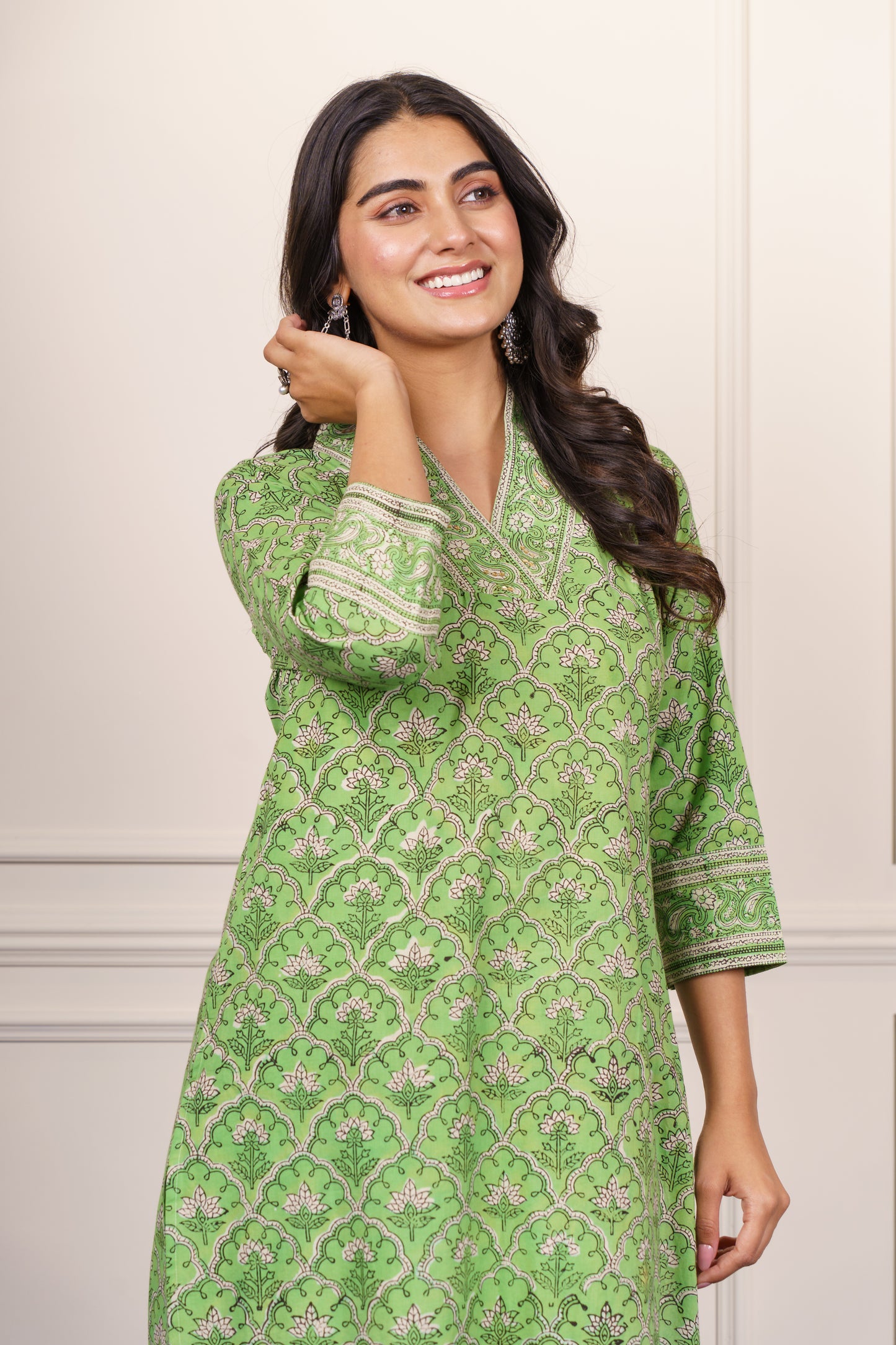 This elegant green cotton kurta features a classic Mughal-inspired block print in a soothing pattern. Designed with a flattering straight cut, three-quarter sleeves, and a V-neckline adorned with fine detailing, it offers both comfort and charm. Ideal for daily wear or casual outings, this breathable fabric ensures all-day ease with timeless ethnic style.