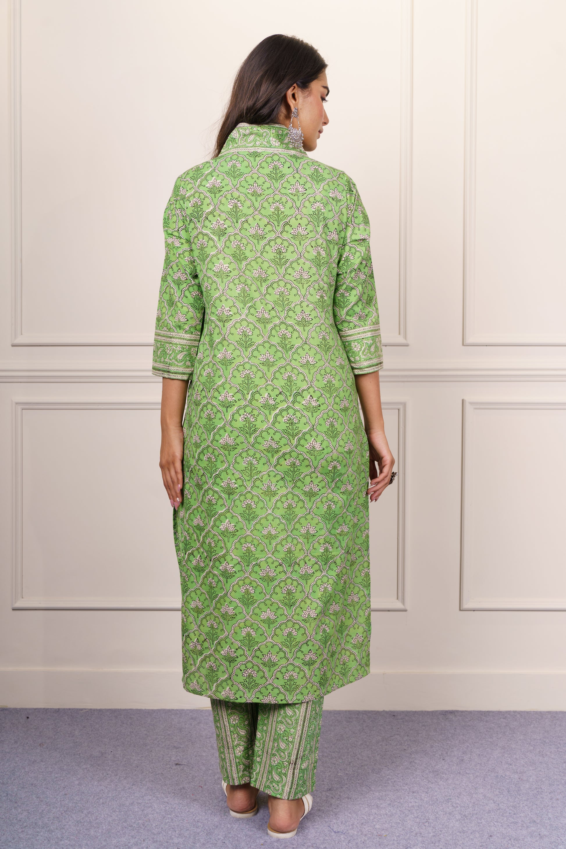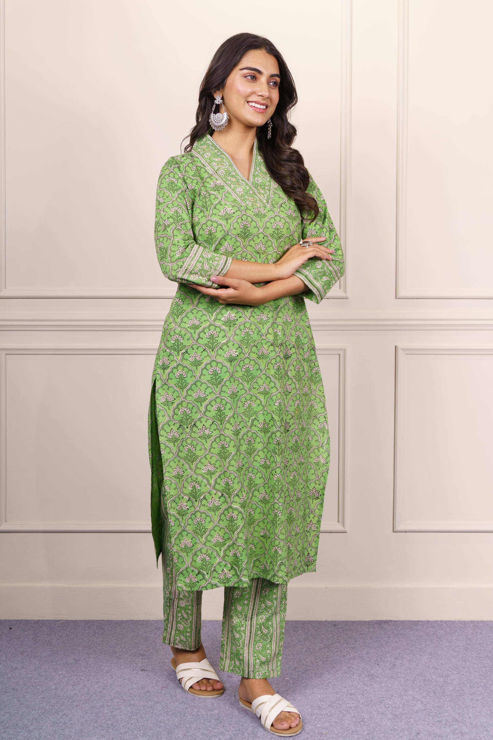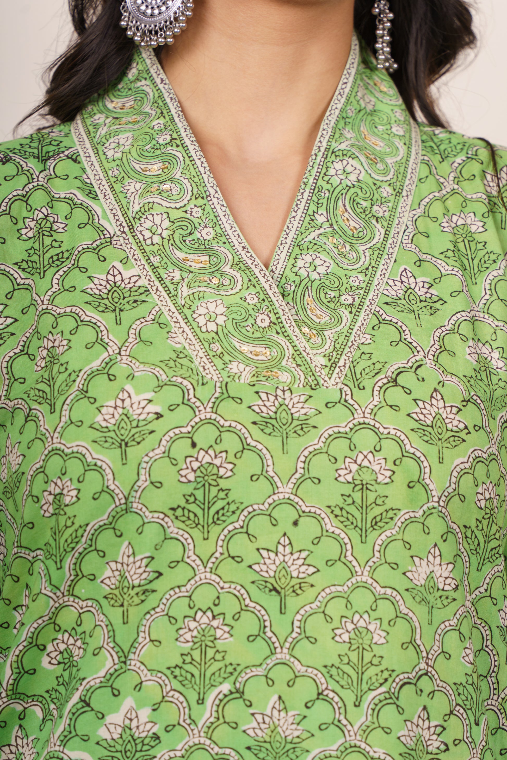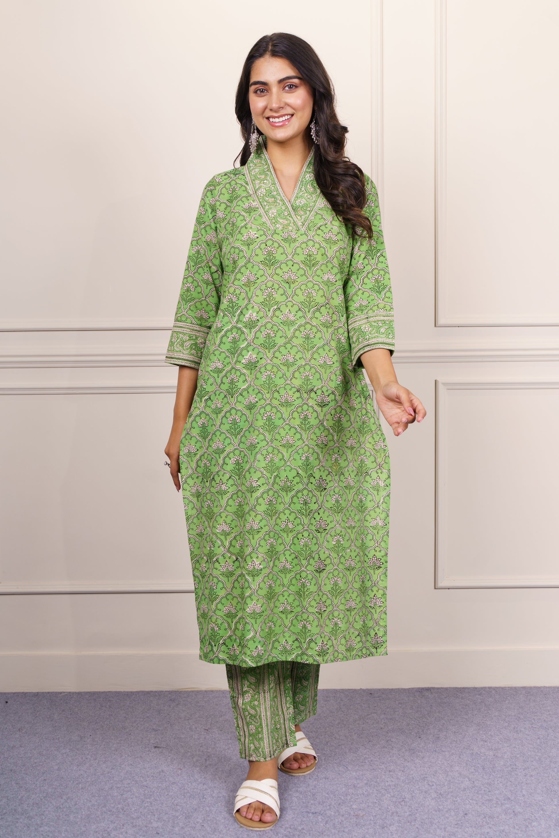 This elegant green cotton kurta Set features a classic Mughal-inspired block print in a soothing pattern. Designed with a flattering straight cut, three-quarter sleeves, and a V-neckline adorned with fine detailing, it offers both comfort and charm. Ideal for daily wear or casual outings, this breathable fabric ensures all-day ease with timeless ethnic style.