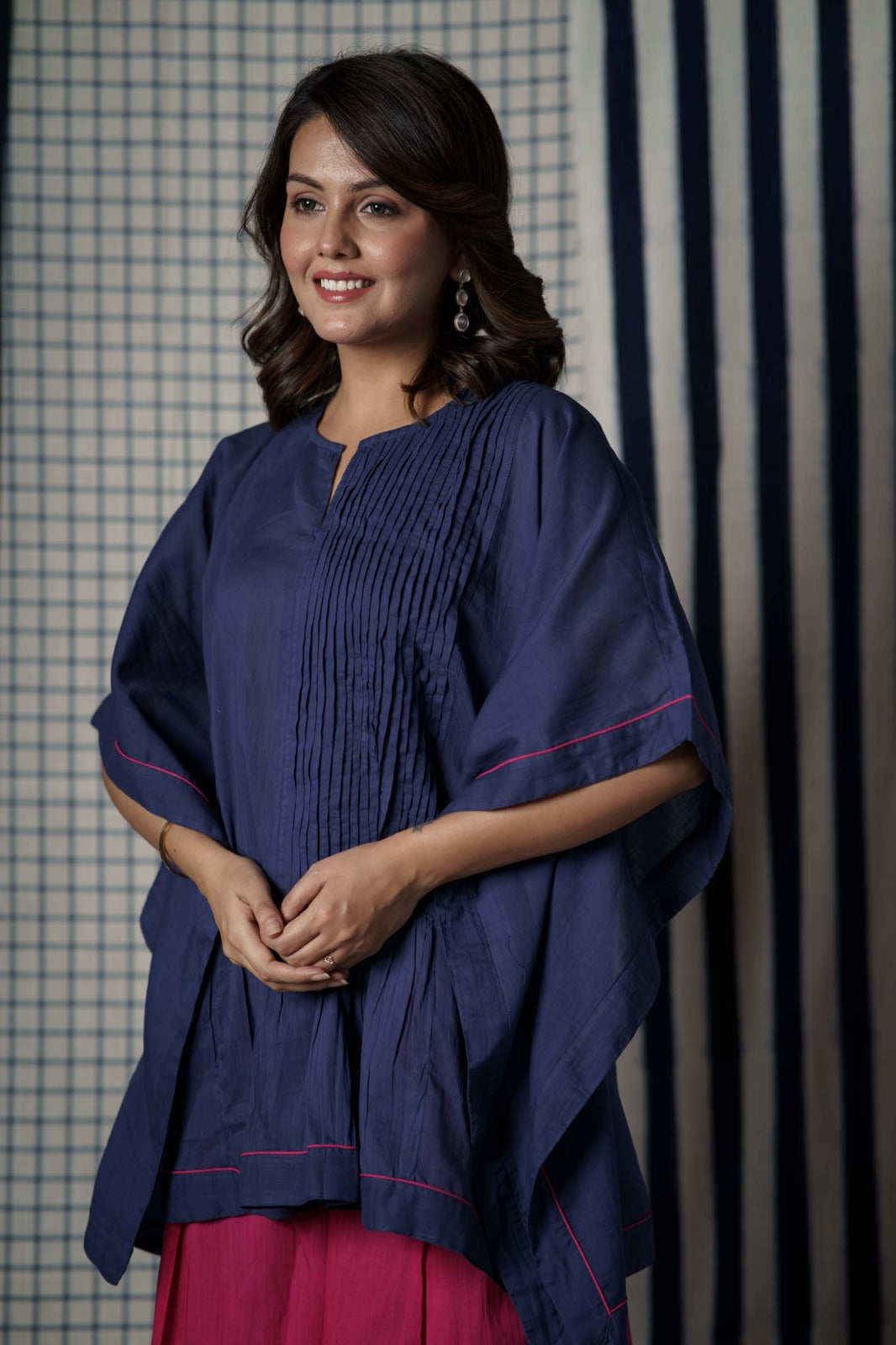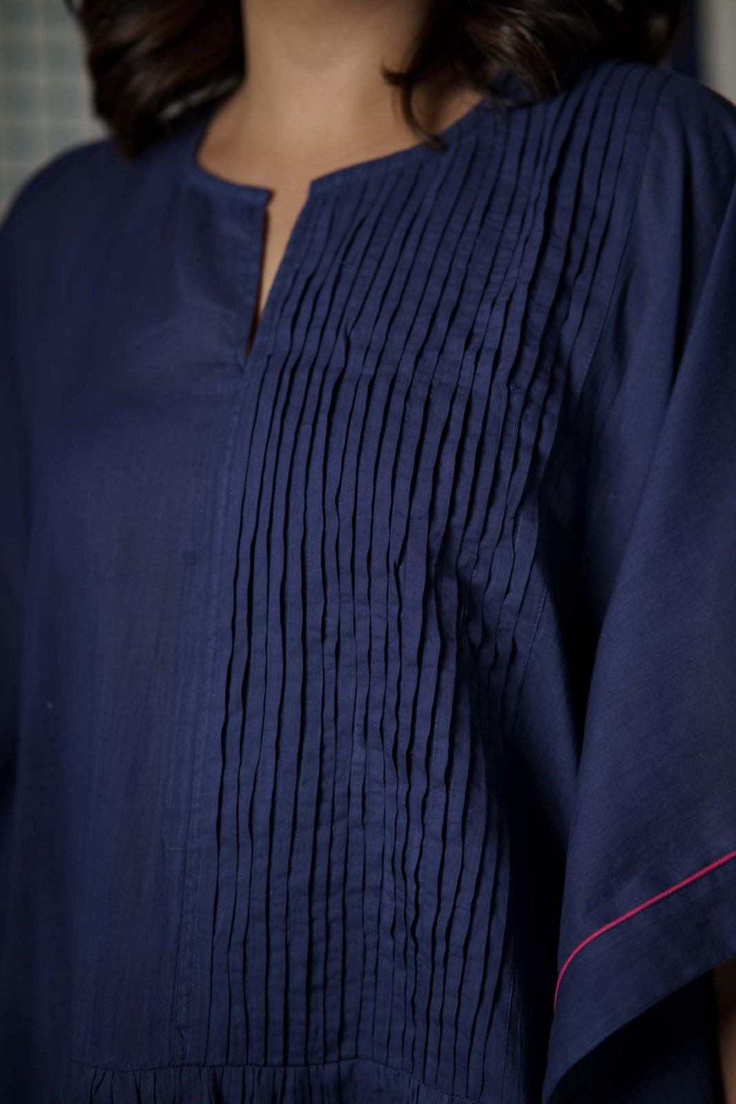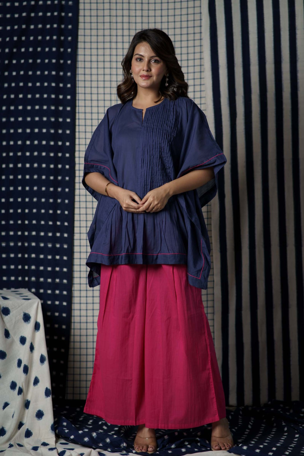 Solid pink and blue color combination mulmul fabric kaftan top and palazzo co-ord set. This kaftan has pintucks styling on one side with piping all over.