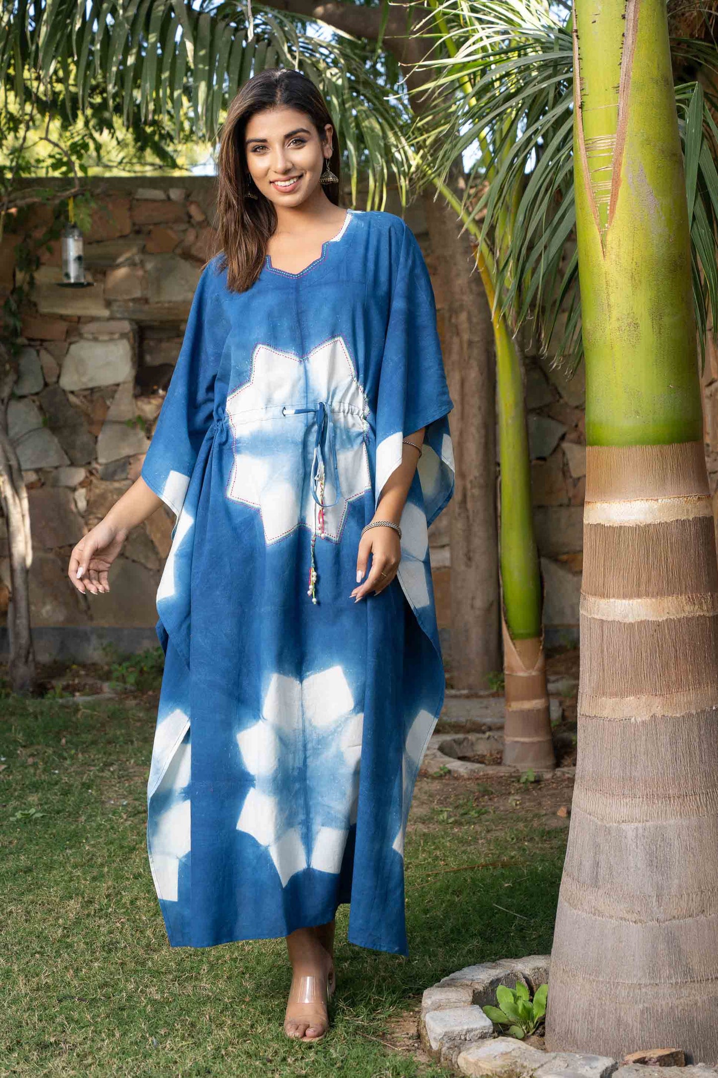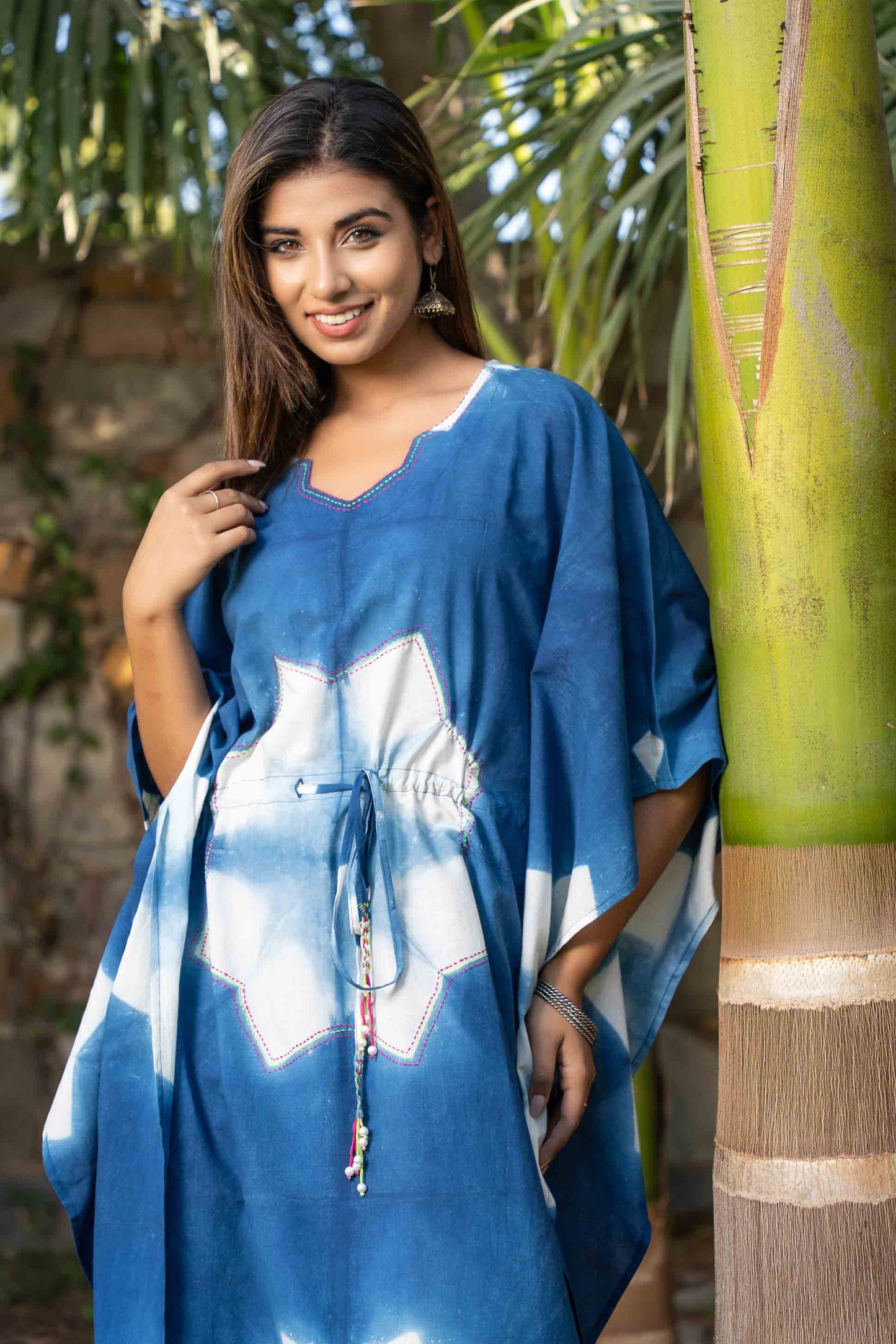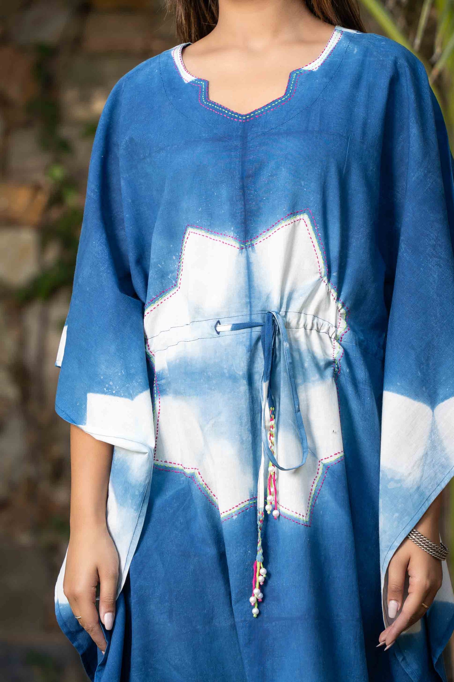 Style yourself with this clamp dye hand block printed long kaftan dress in blue and white color combination. Kantha detailing adds beauty to the piece.