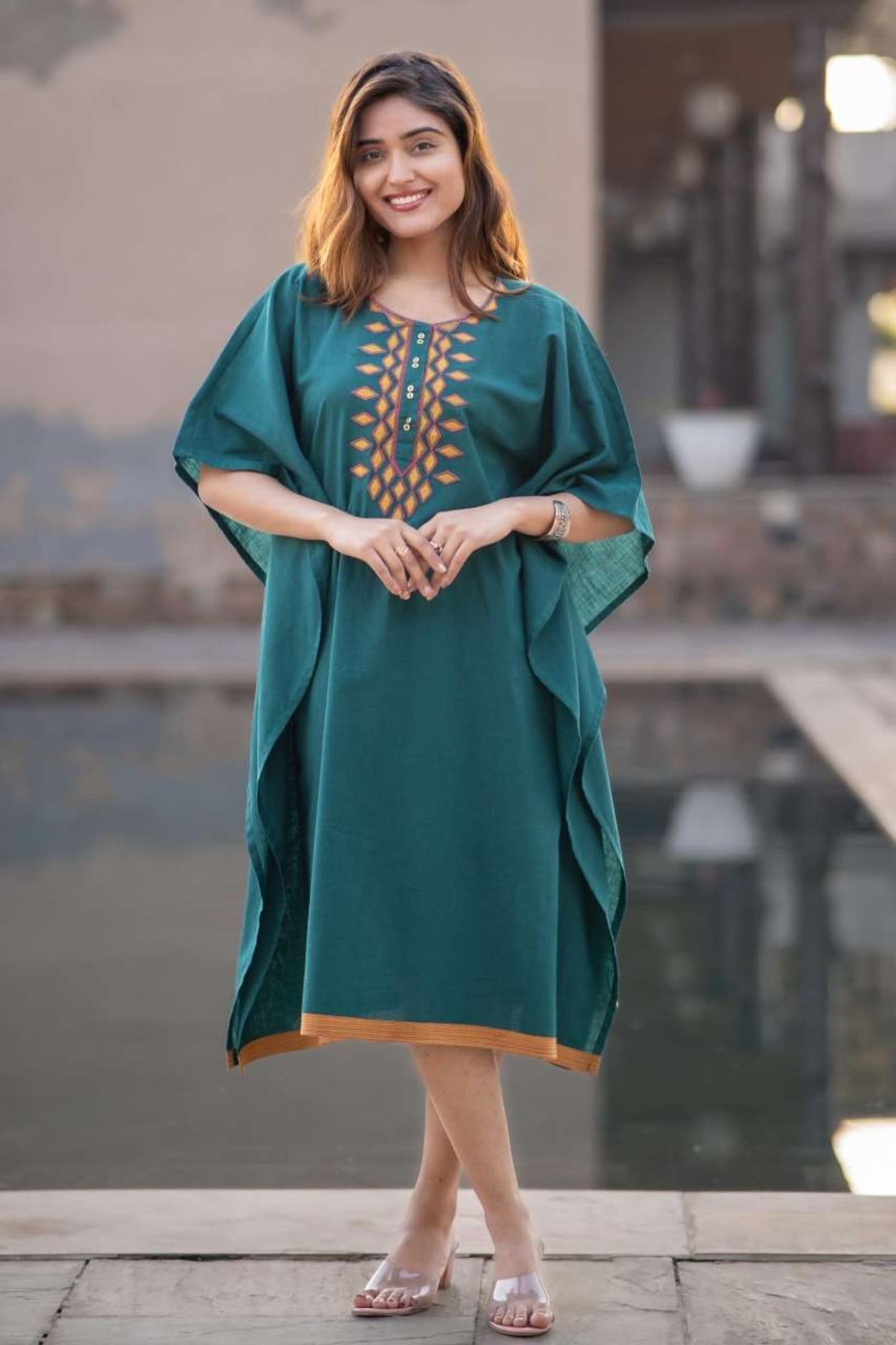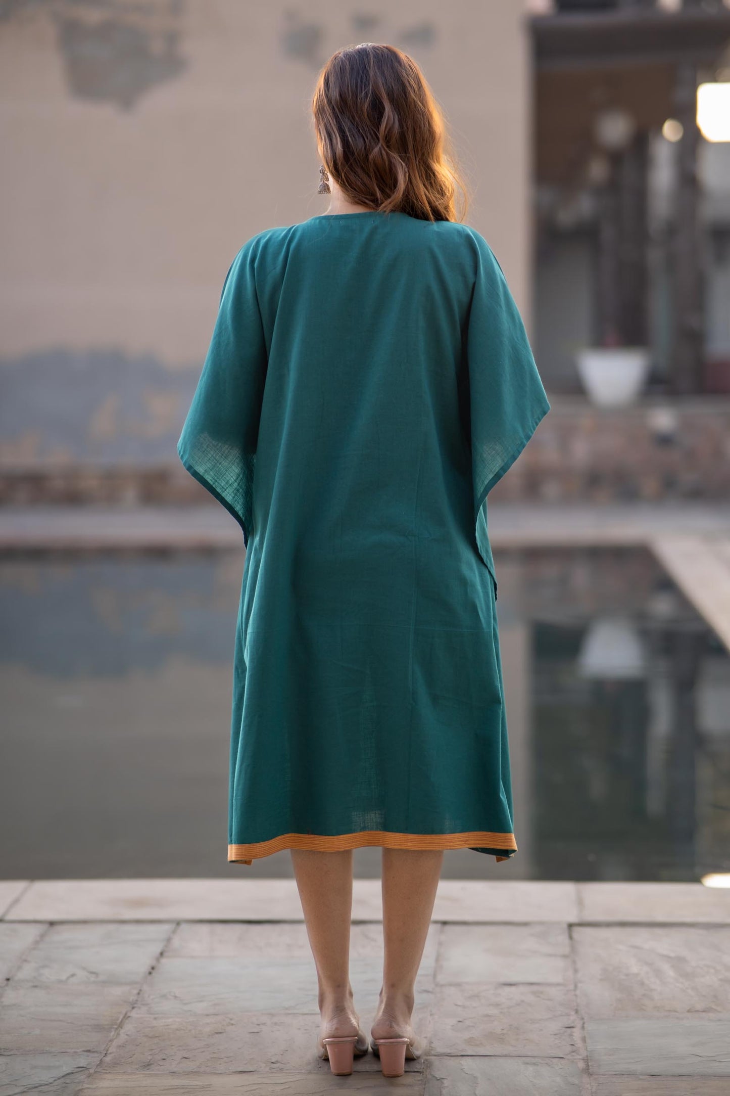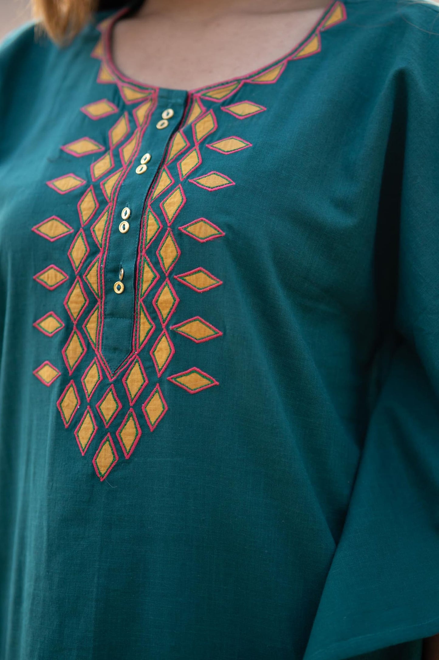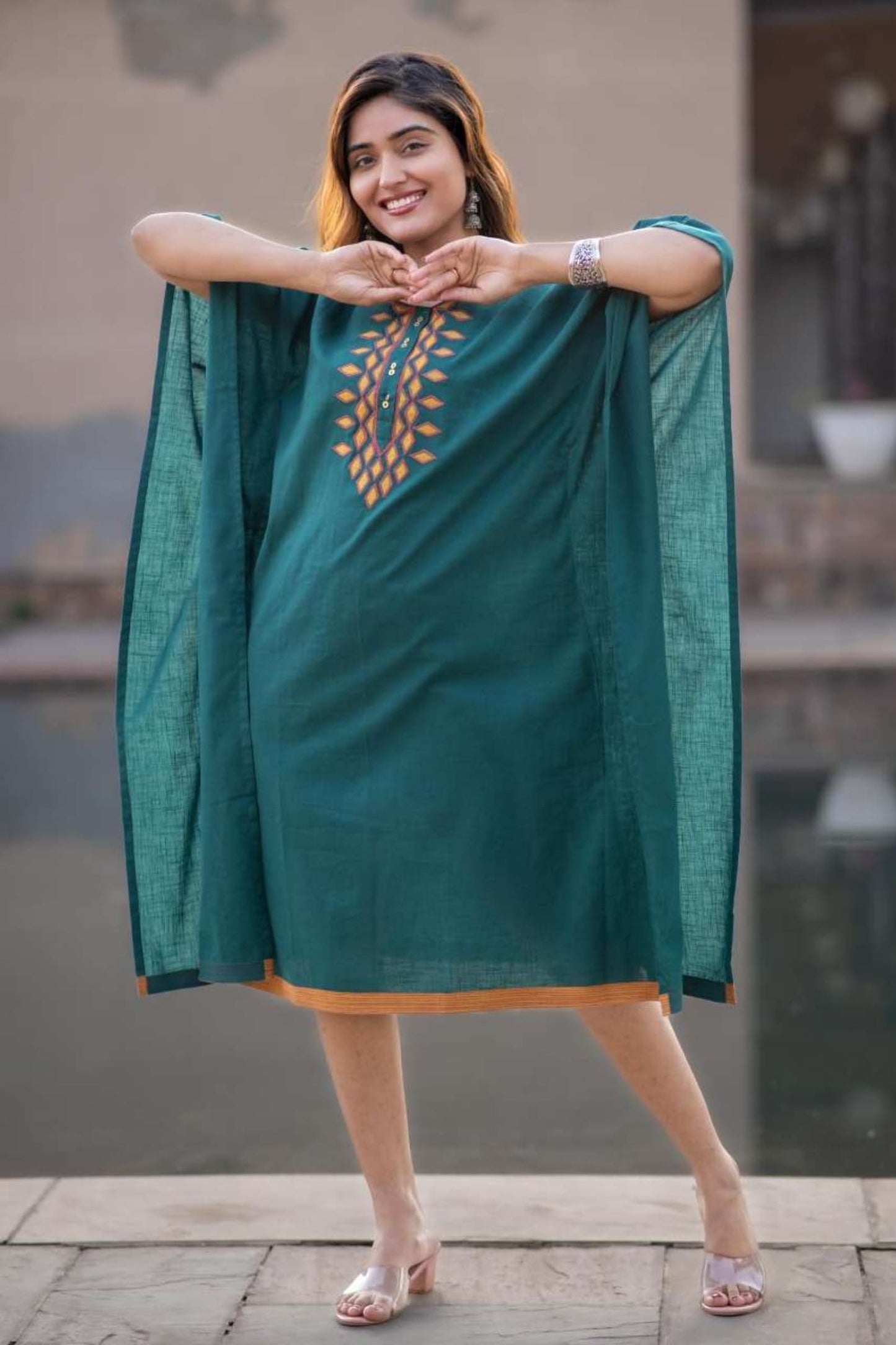 Teal green applique work done on slub cotton fabric kaftan dress. The yoke has beautiful patch work done with border running around.