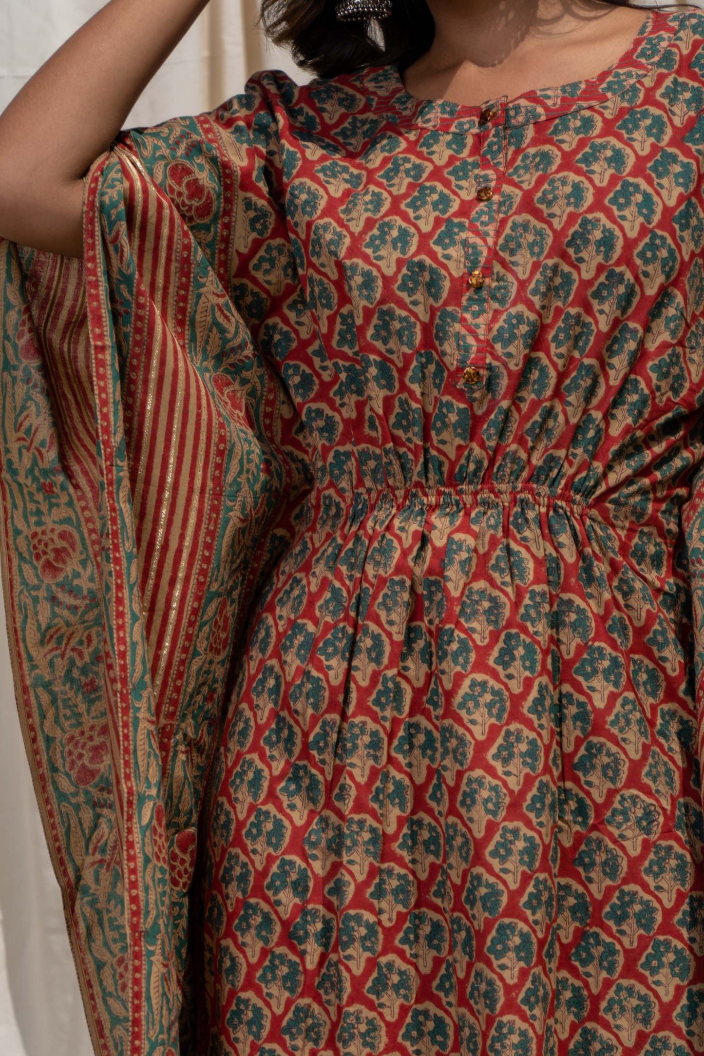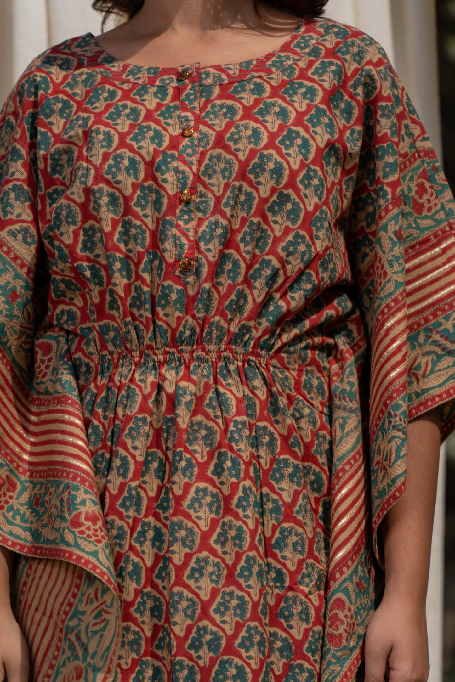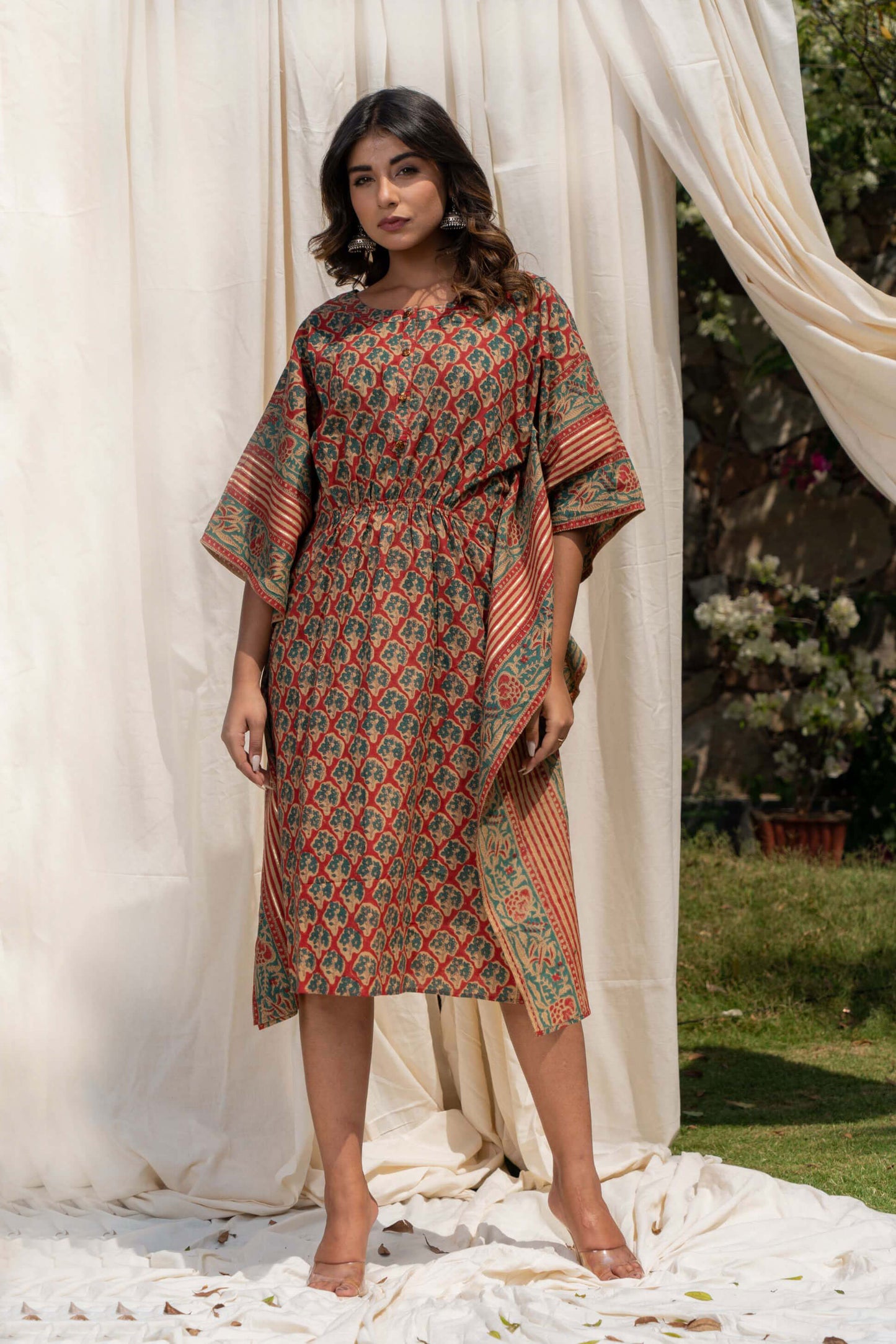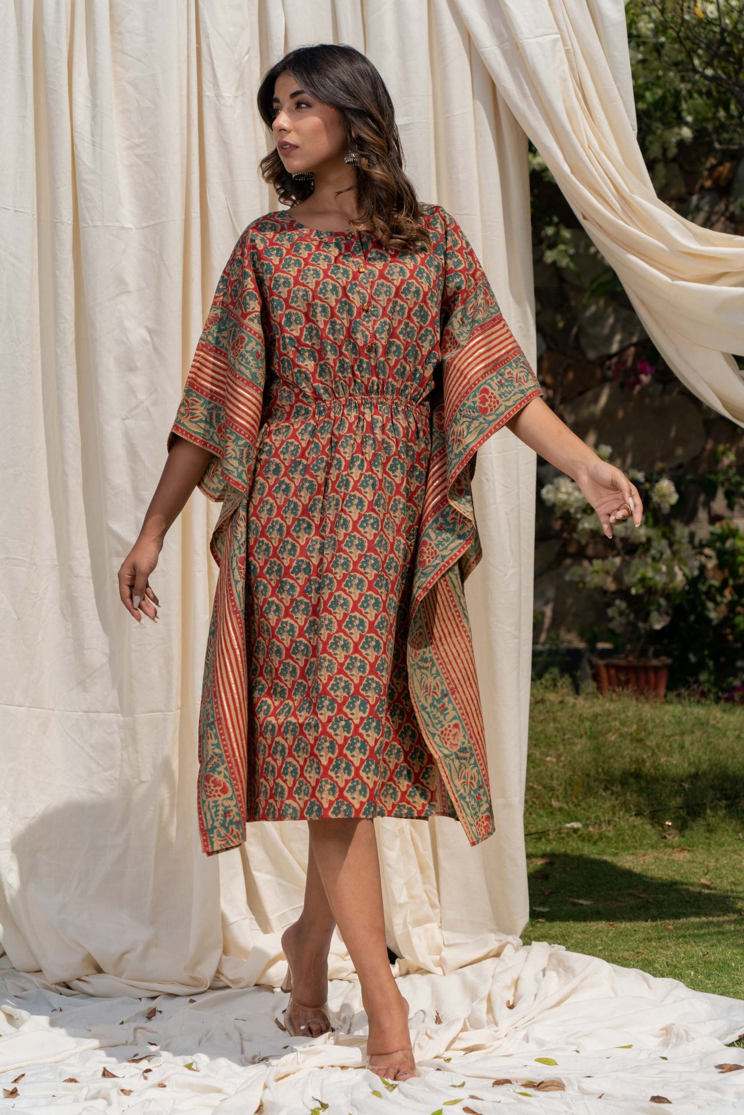 Grab this knee length green and red color hand block printed cotton kaftan dress.