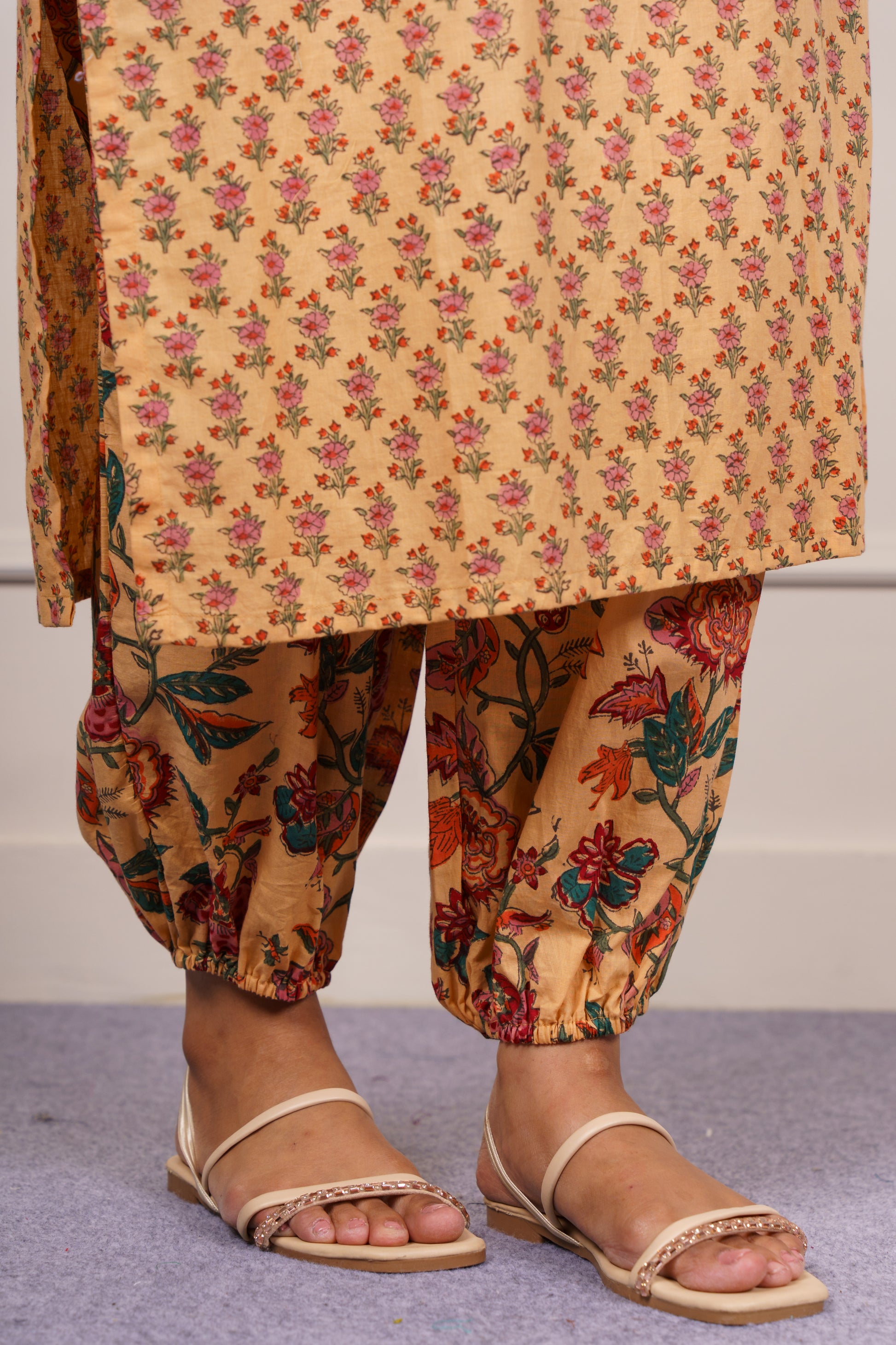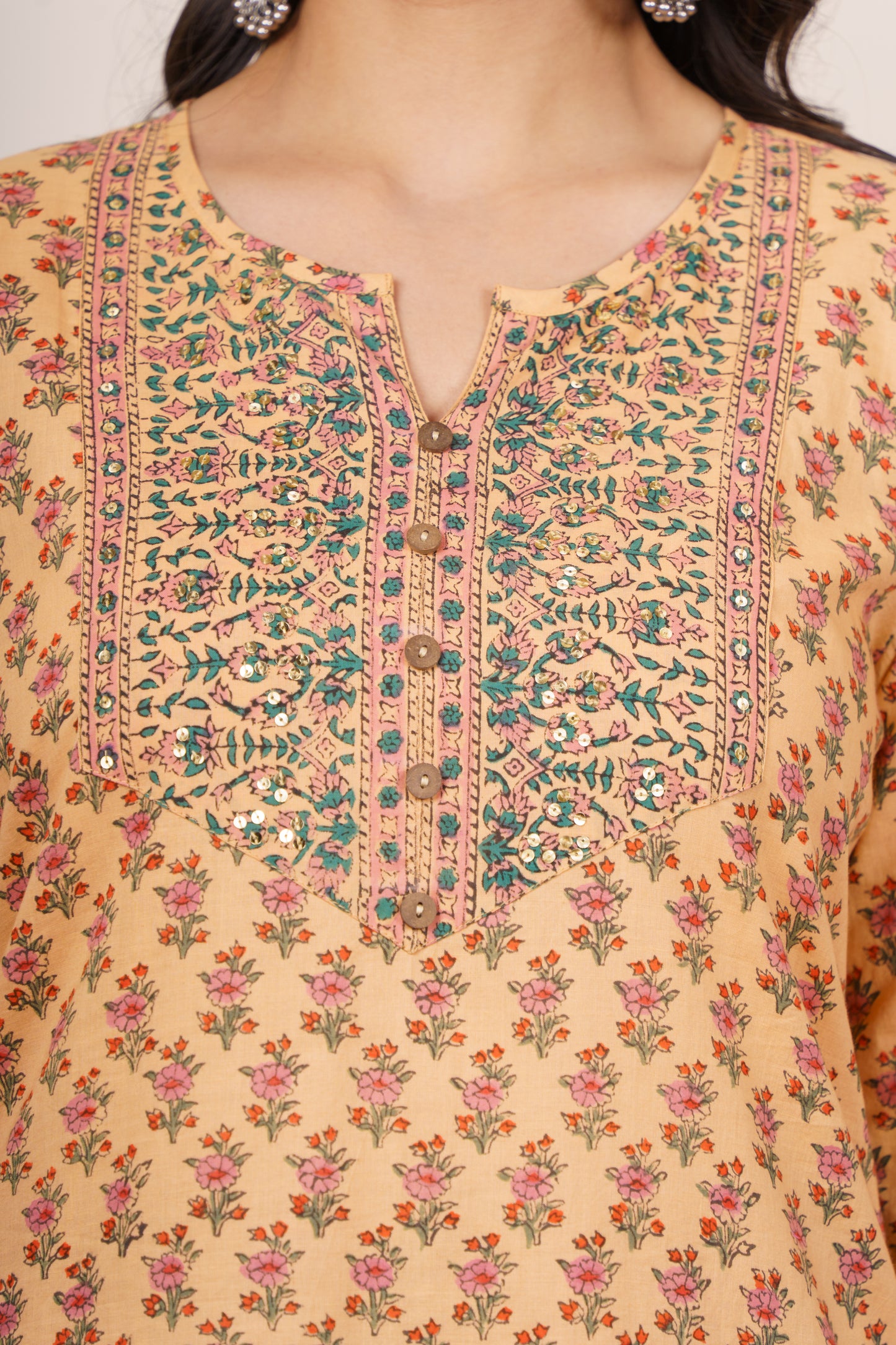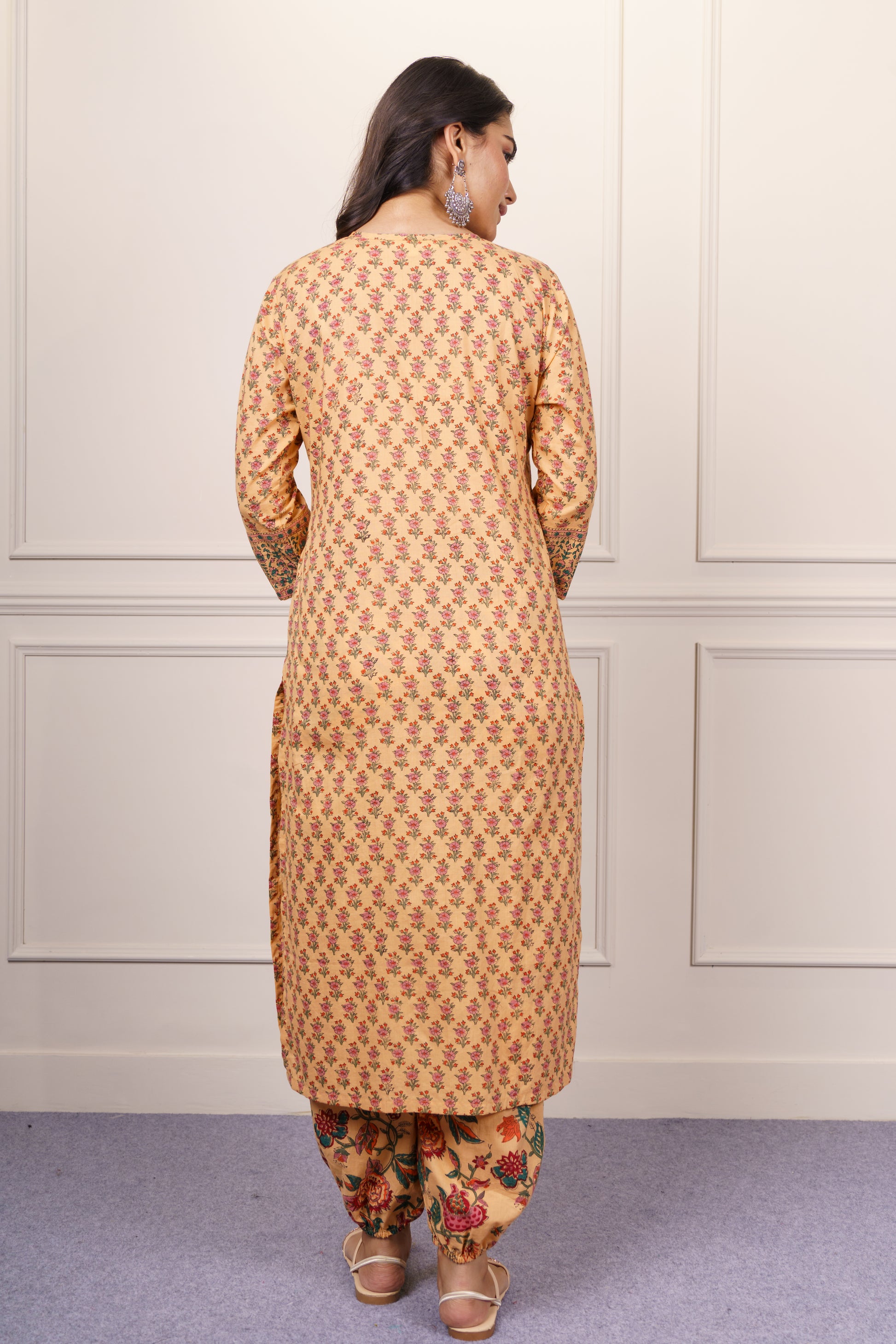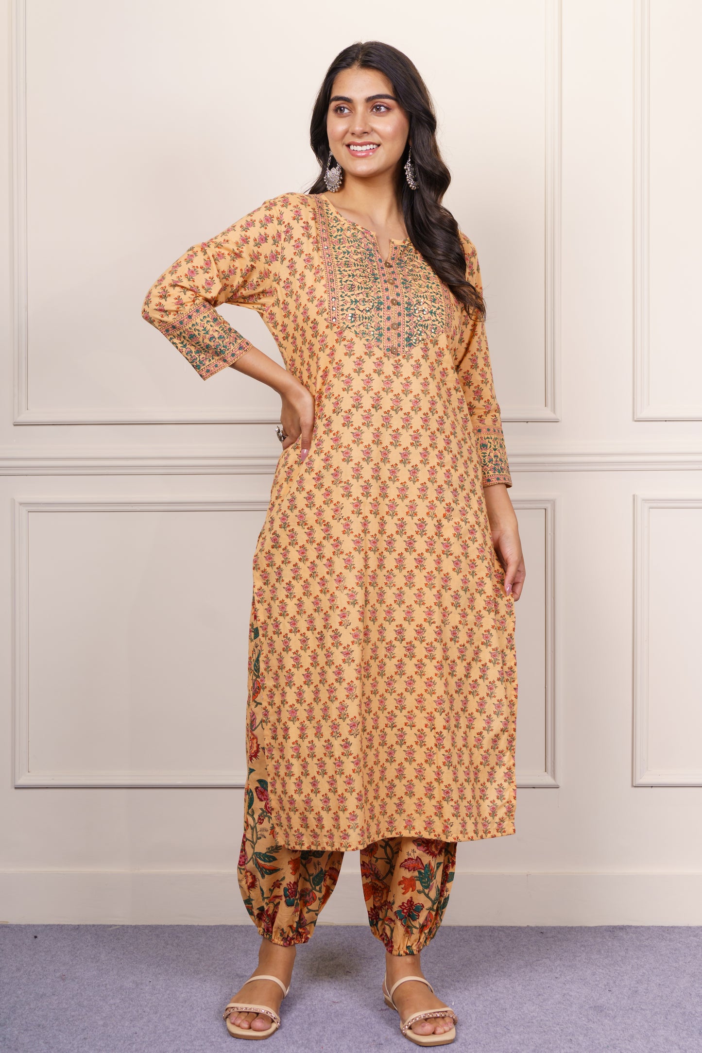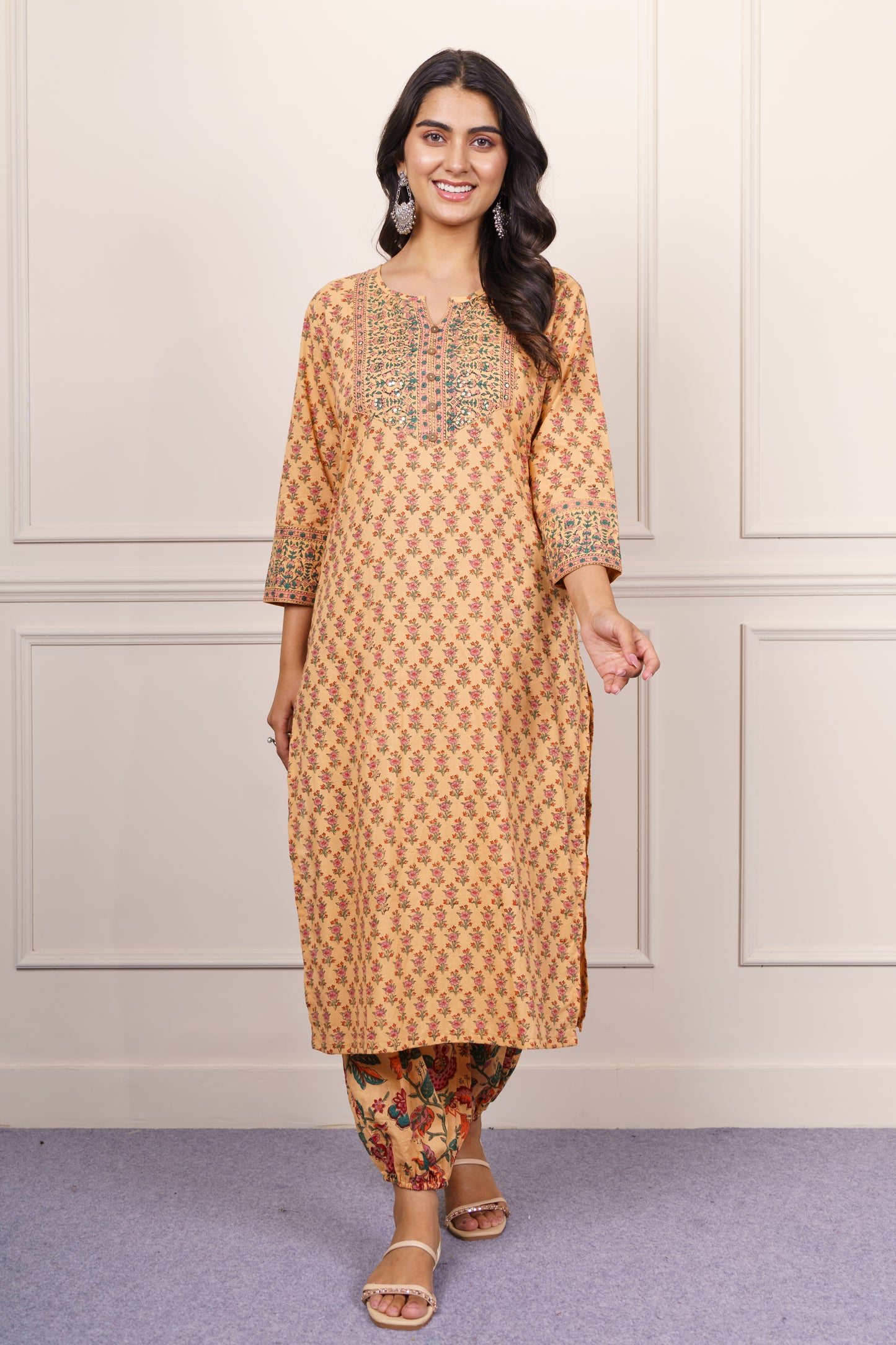 Add a pop of tradition to your wardrobe with this mustard yellow cotton kurta set. Highlighted by intricate multicolor floral block prints and a finely detailed yoke, it offers a breezy silhouette with 3/4 sleeves. Paired with a coordinating floral Patiala, this ensemble is ideal for festive events, casual brunches, or everyday ethnic elegance.
