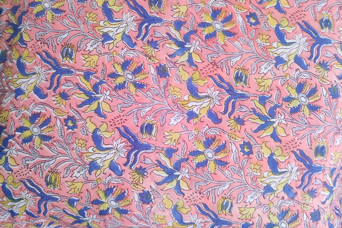 PEACH FLORAL HAND BLOCK PRINTED COTTON FABRIC-HF6372