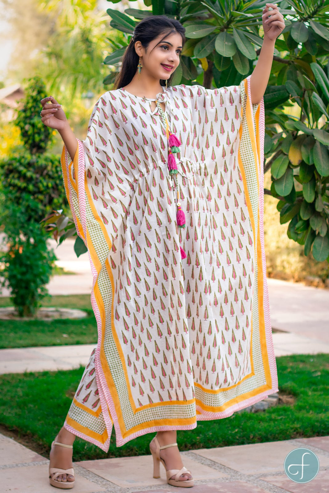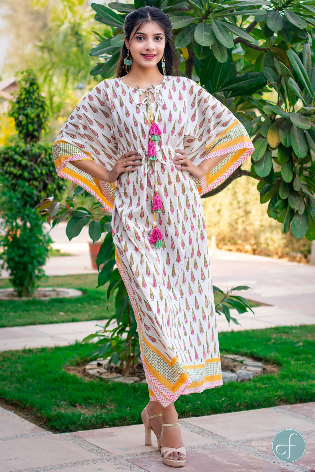 White base cotton kaftan dress with a drawstring and elbow sleeves to give trendy looks. Stylish tassels are there at the end of the drawstrings.