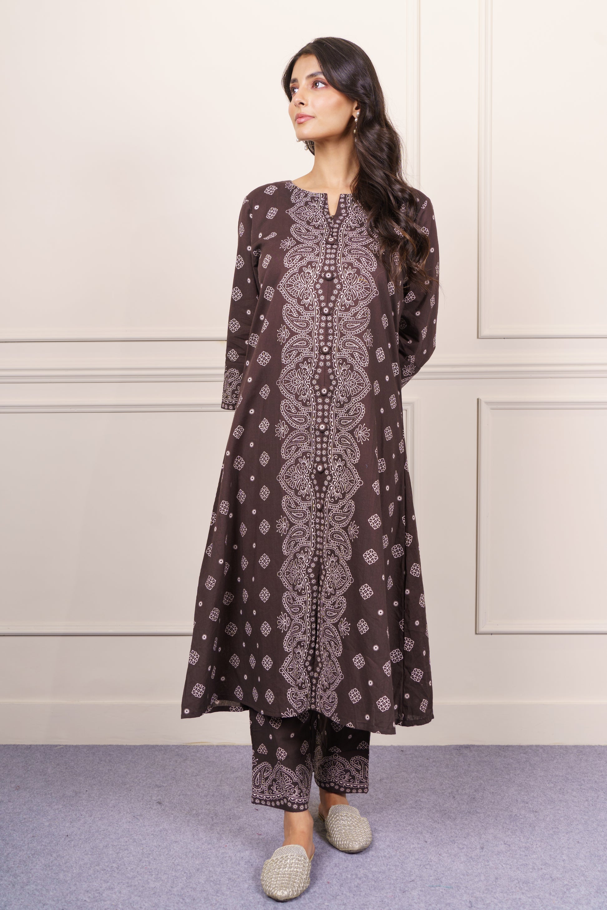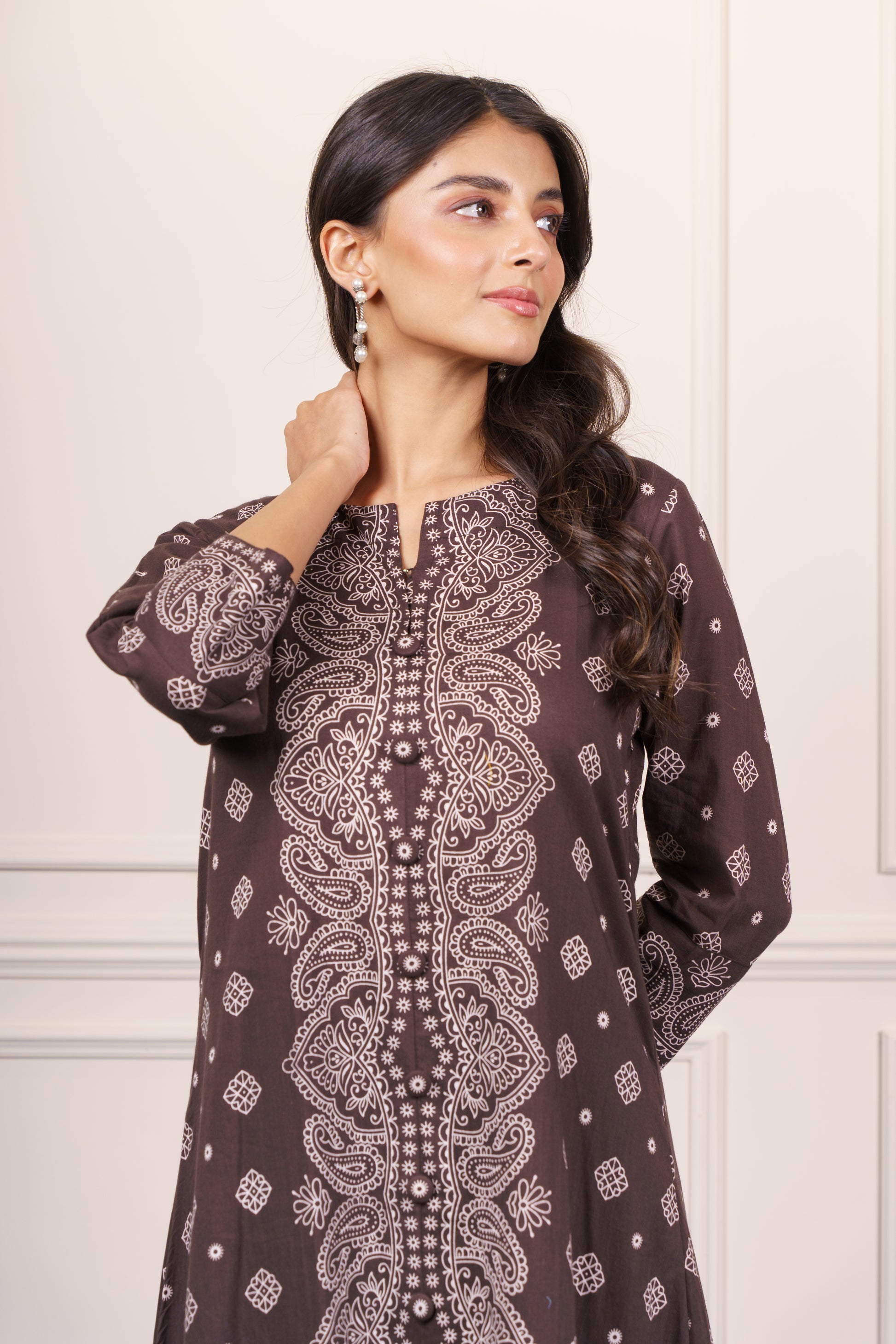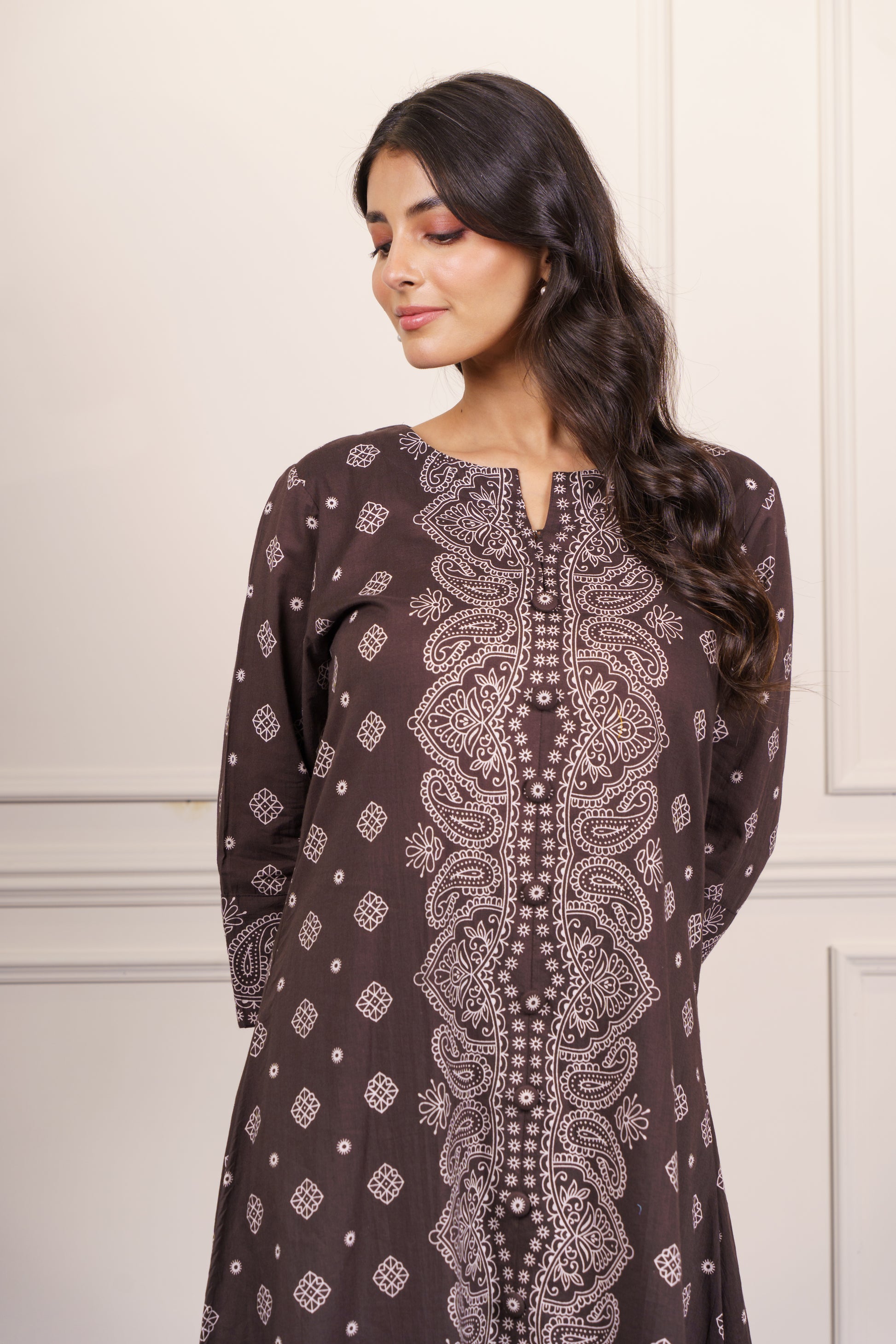 This Very Dark Brown cotton kurta features a graceful A-line silhouette adorned with intricate hand block printed motifs. Highlighted with a central design panel and delicate buttons for added charm, this a line kurta blends timeless elegance with everyday comfort—perfect for both casual and festive wear.