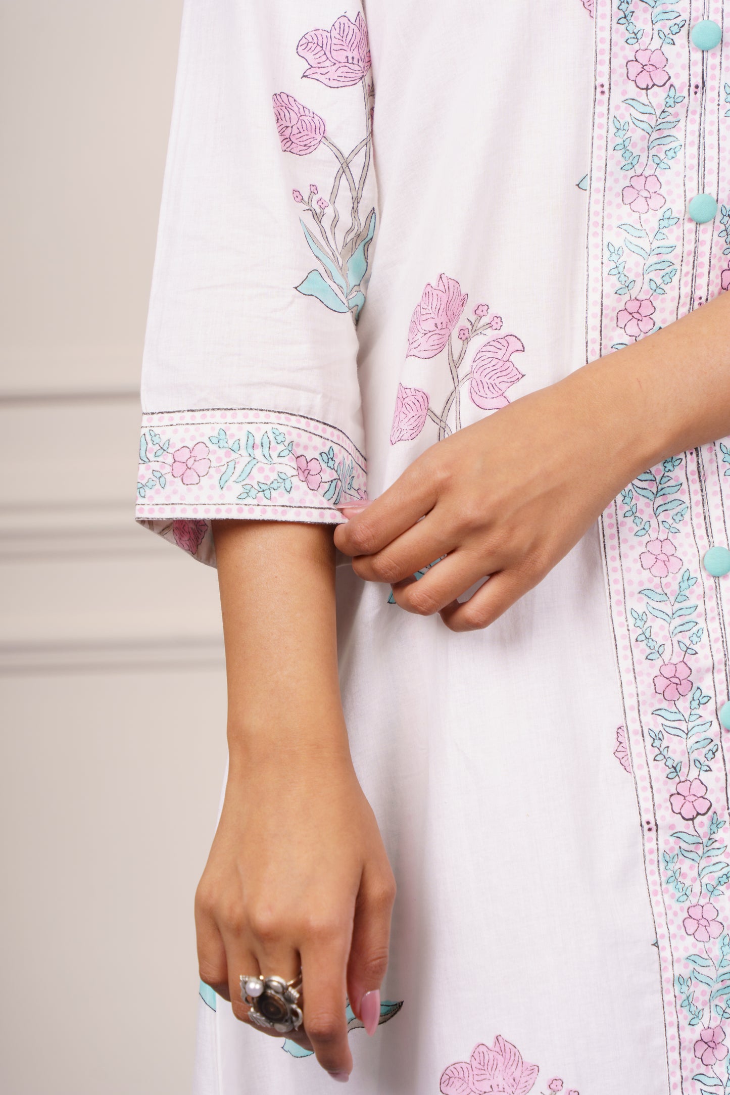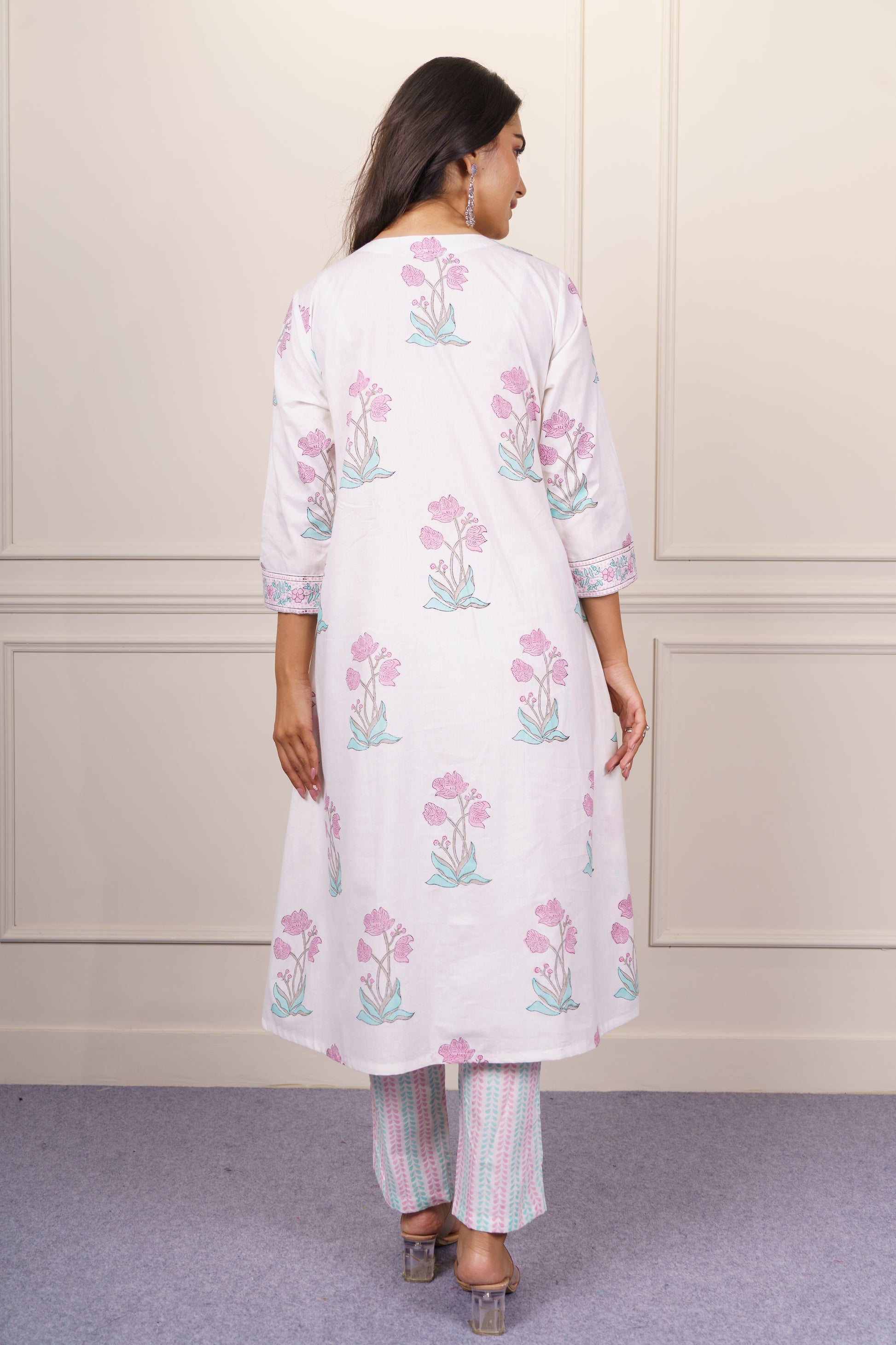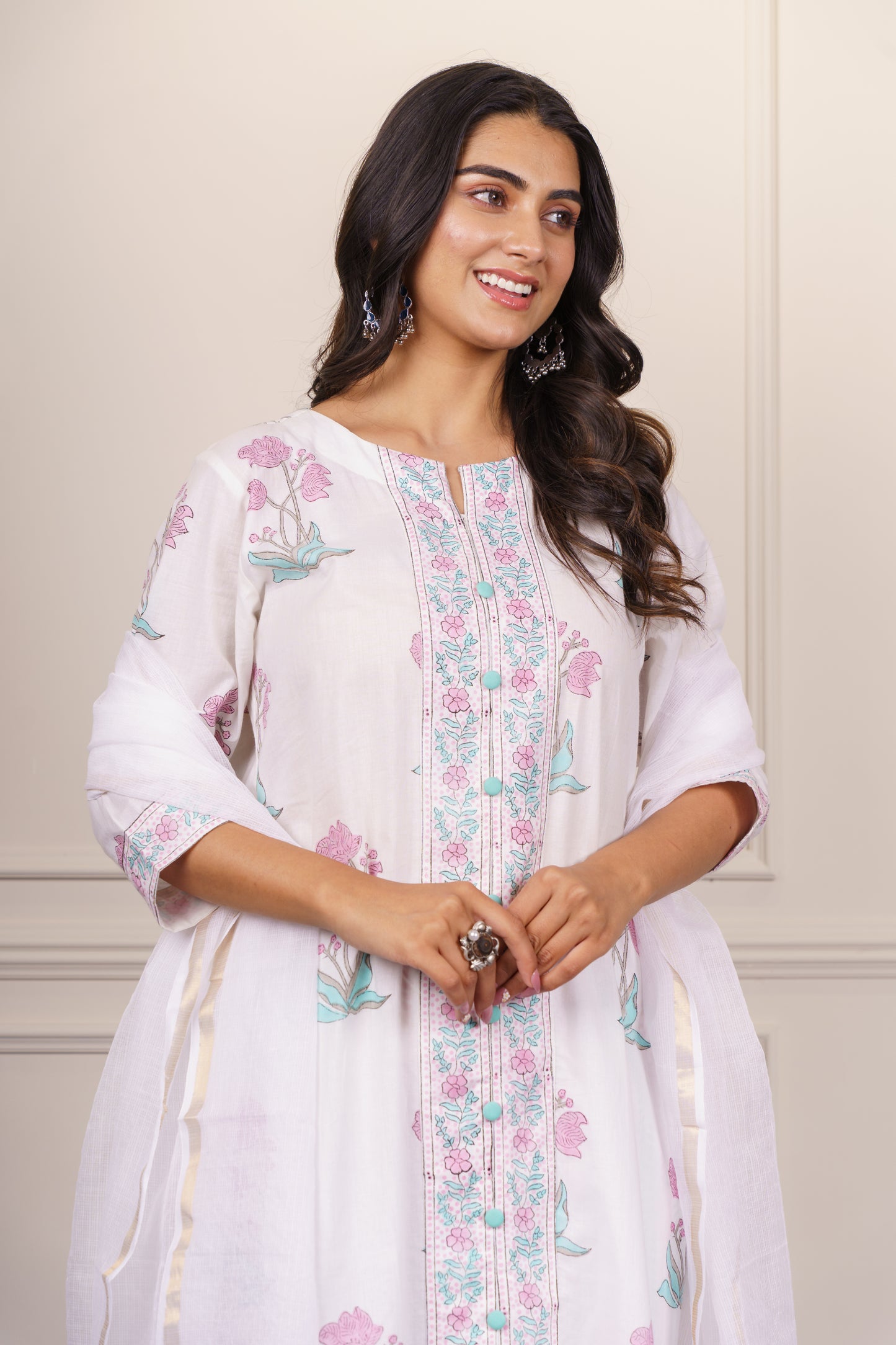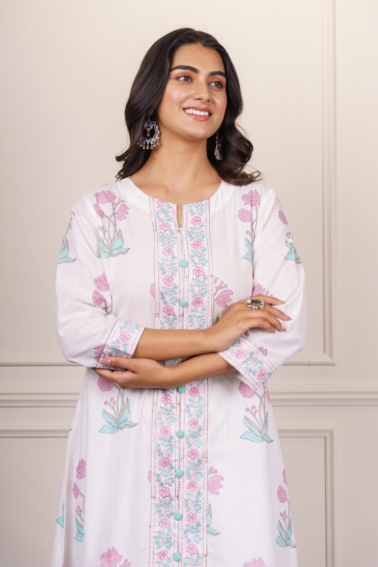 Step into elegance with this White Floral A-Line Kurta, beautifully crafted in soft cotton. Featuring delicate pastel prints and button details, it offers a breezy silhouette perfect for summer days. A charming blend of comfort, femininity, and timeless style.