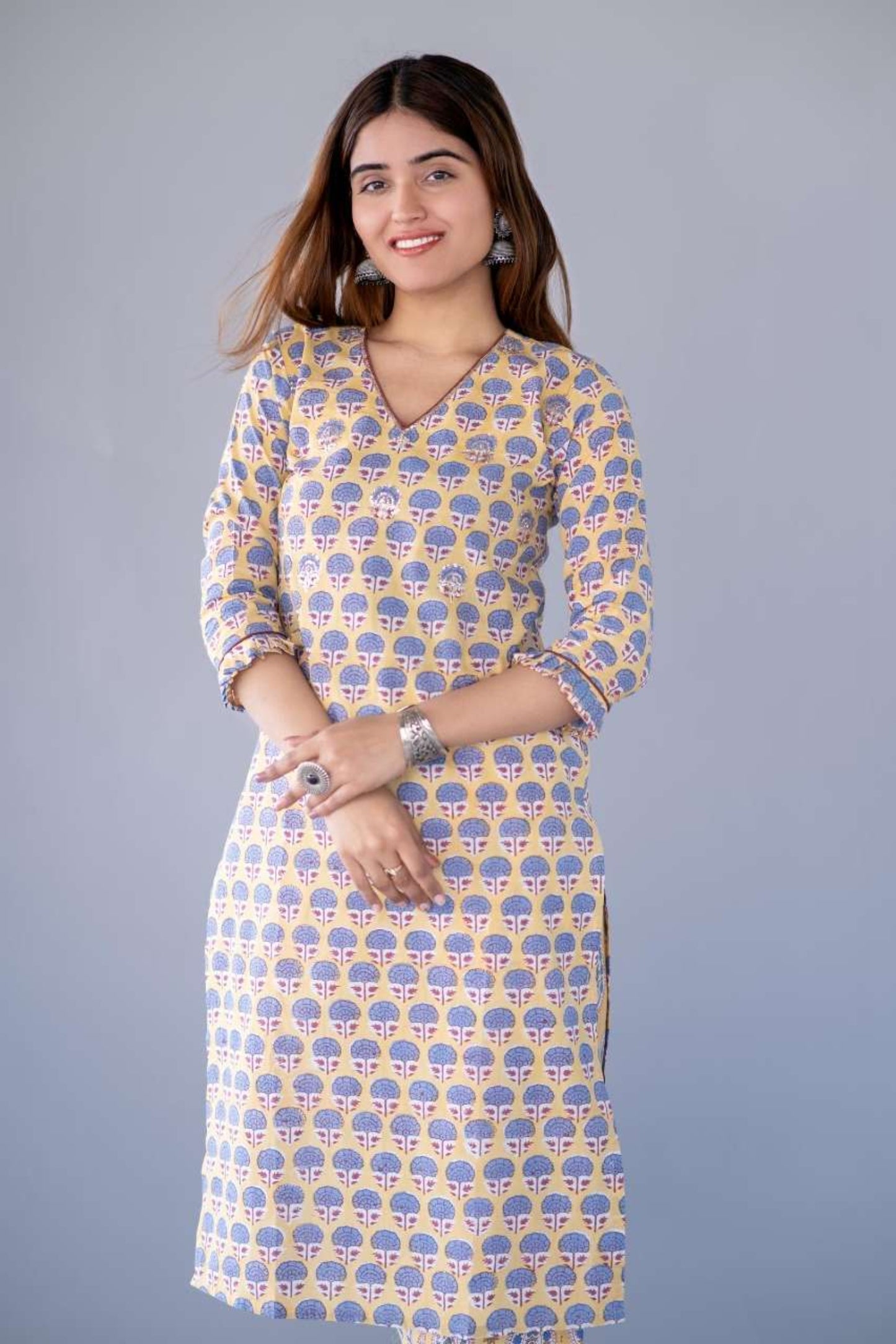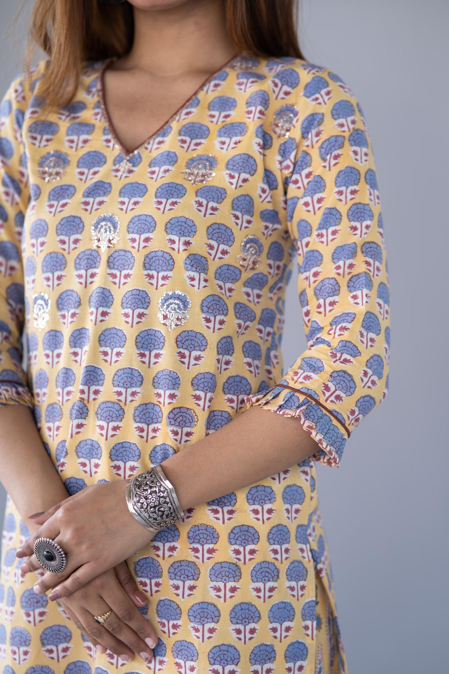 Style yourself in yellow floral hand block printed pure cotton kurta. Three quater sleeves kurta .V shape neck with silver work on the yoke adds beauty to the piece.