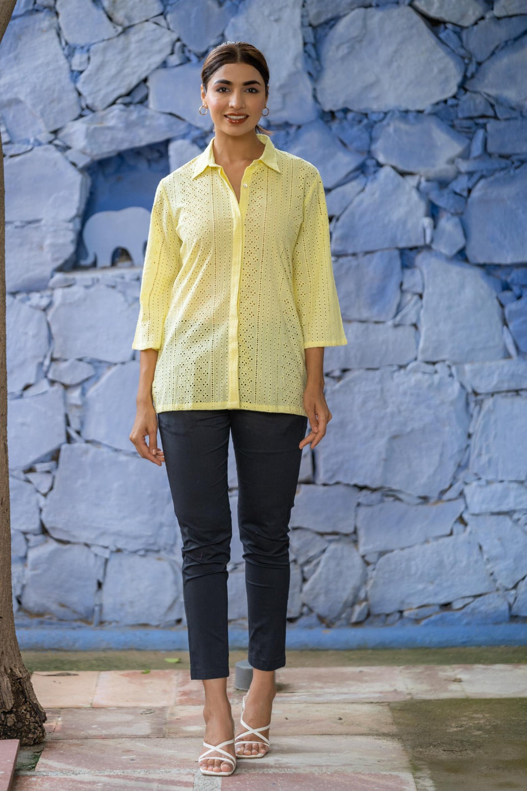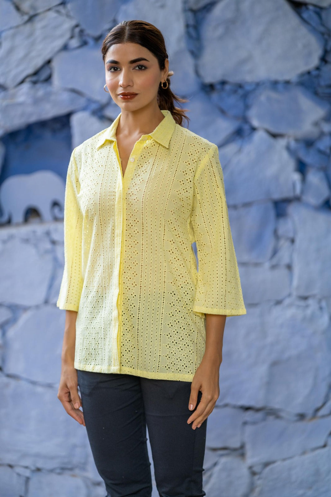 Style yourself with this yellow chikankari shirt top.
