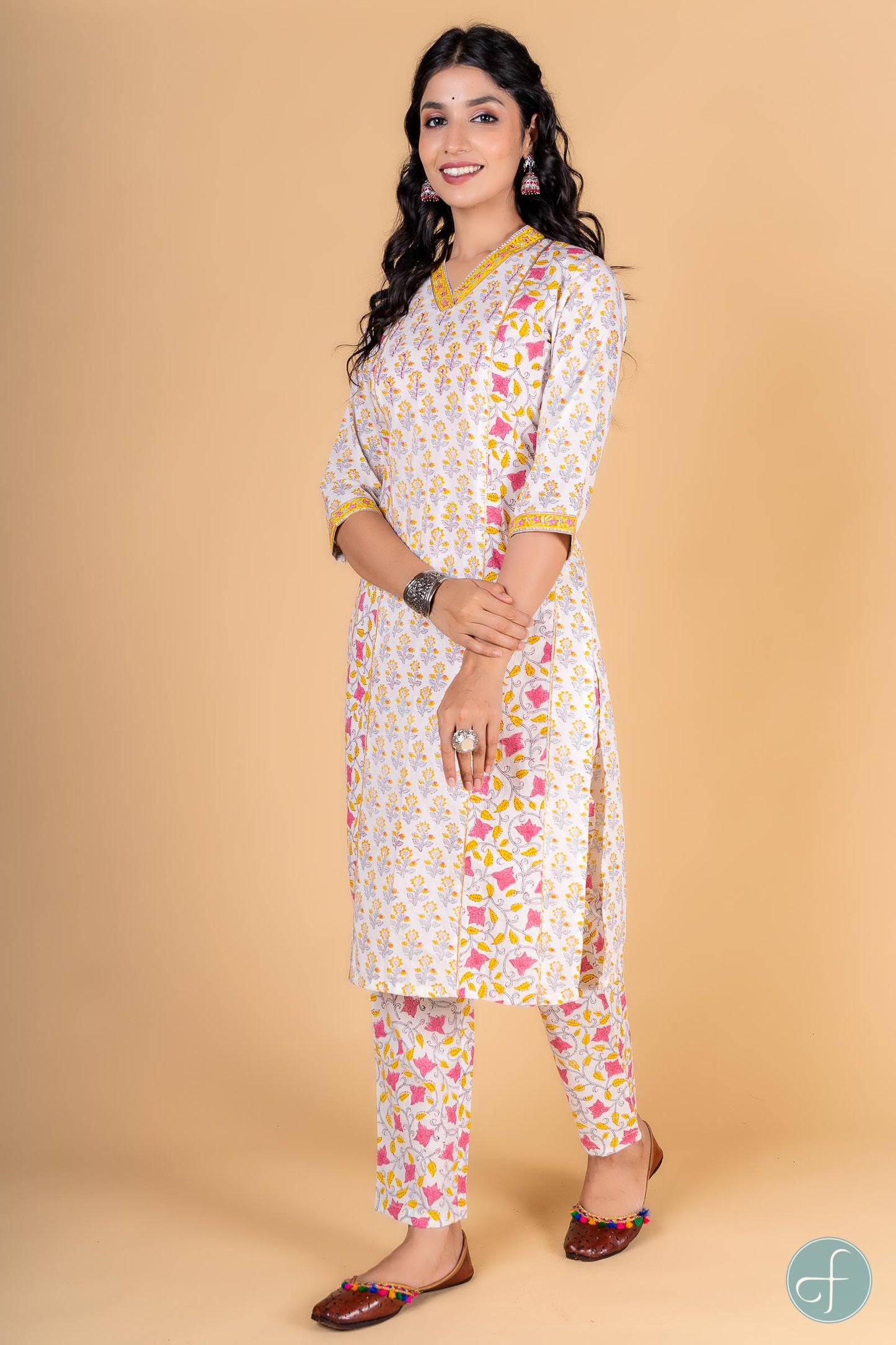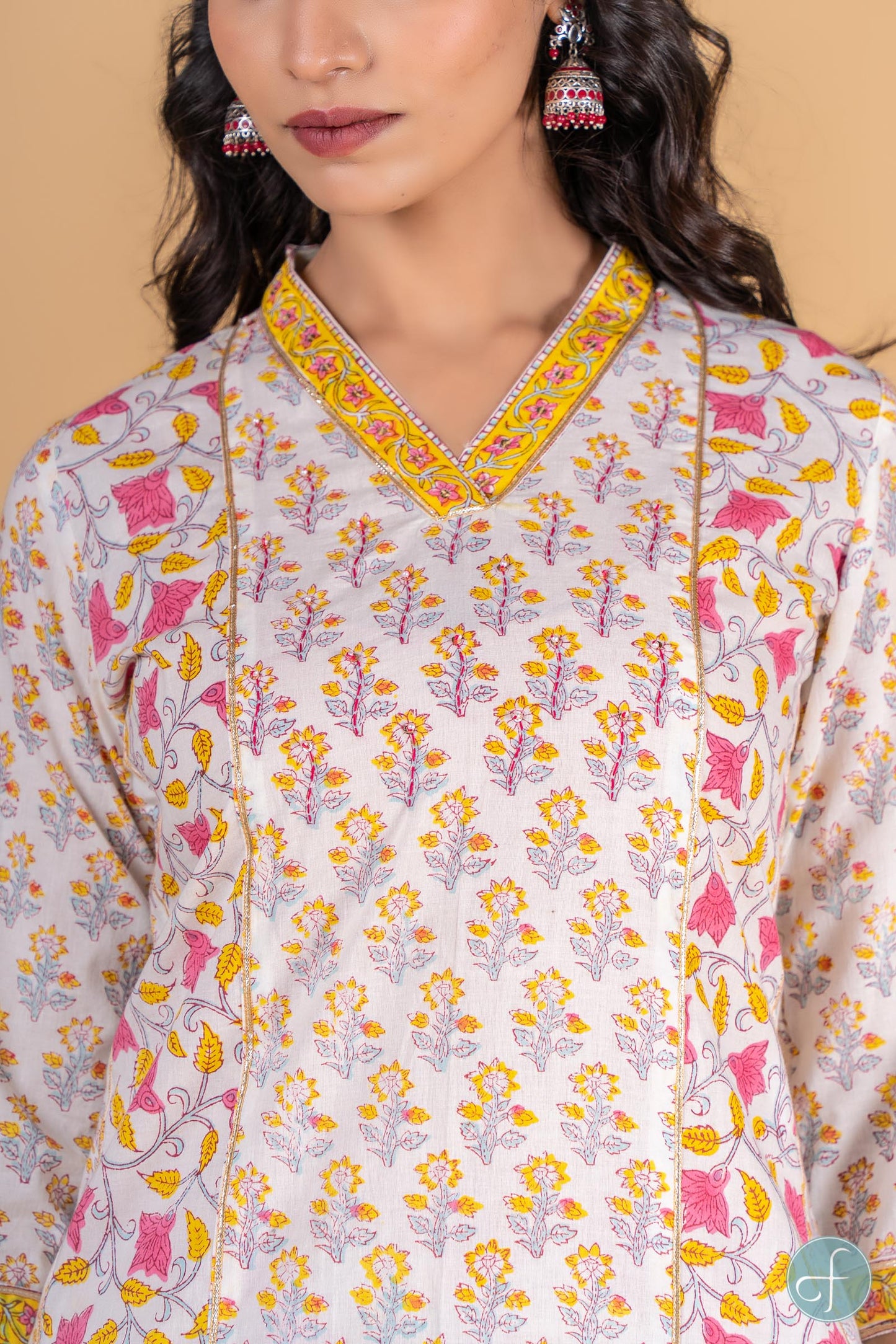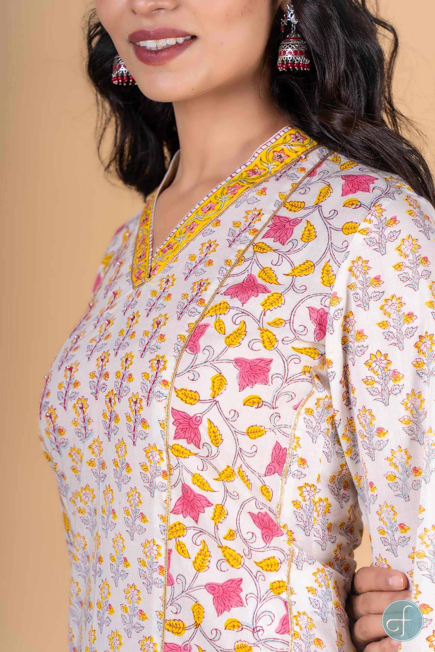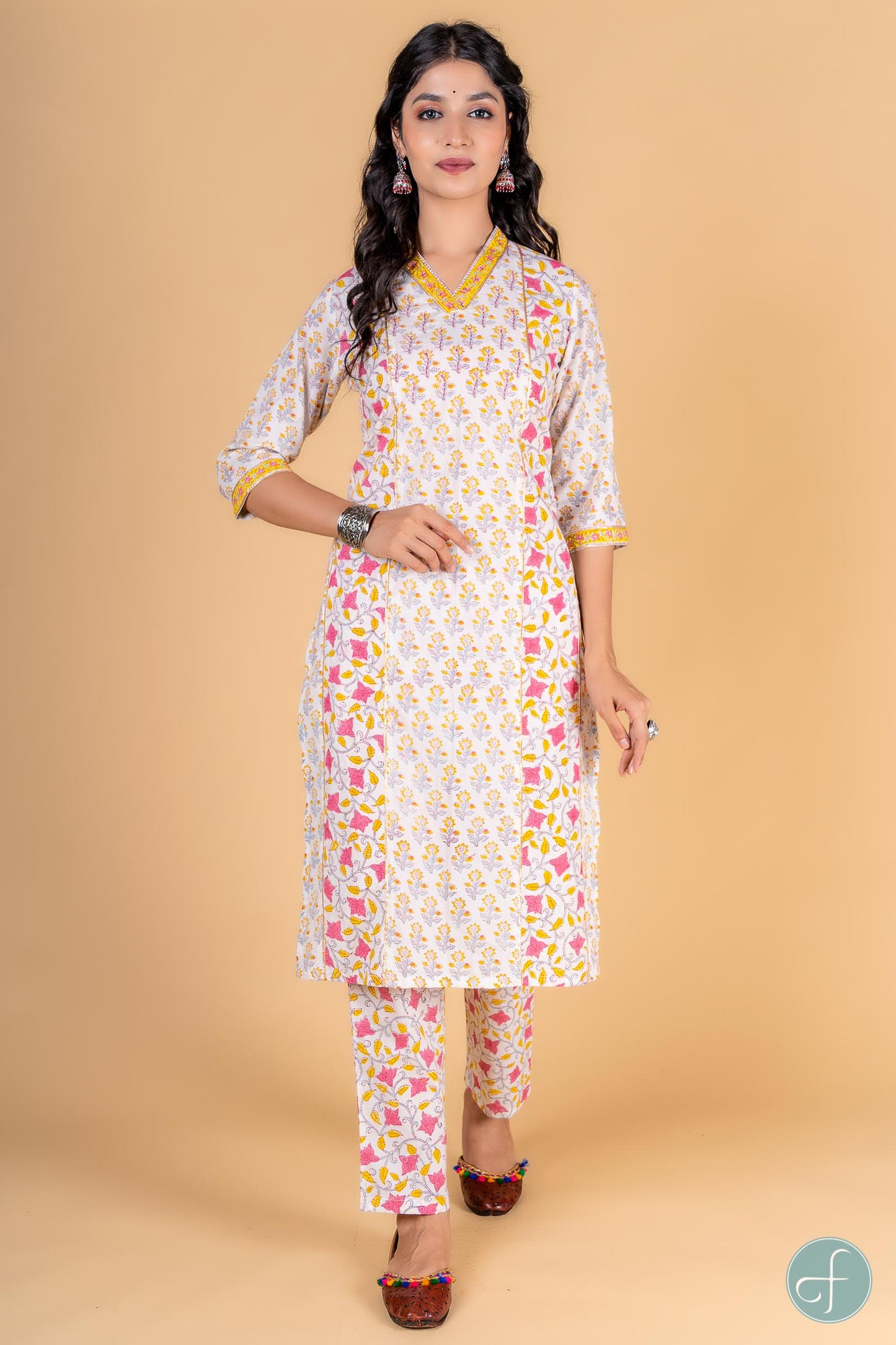 Straight fit kurta dipped in yellow and pink color with floral block print is a perfect choice for the summer season. This 3/4th sleeves kurta is embellished withsequins work at the yoke and border on the V shape neck and sleeves. Gota detailing can be seen on the sleeves and in the front sides as well. It is accompanied with block printed floral pant . Perfect for casual or office wear, this kurta is a must-have in your wardrobe to look stylish.