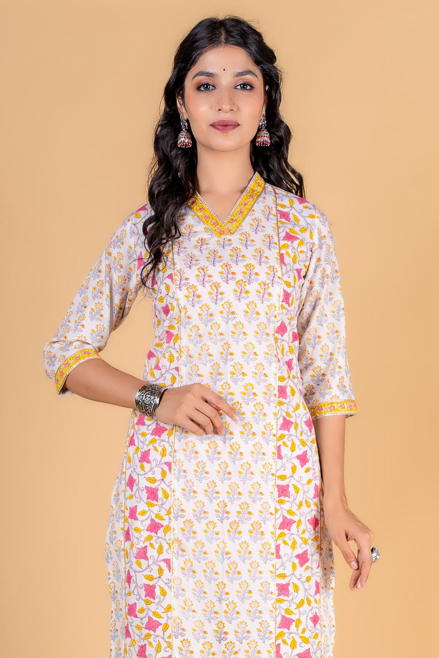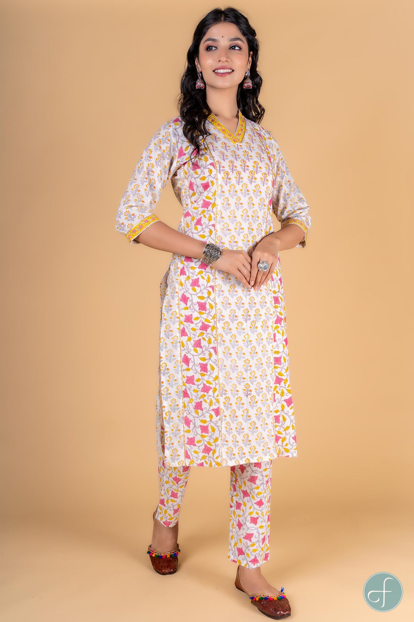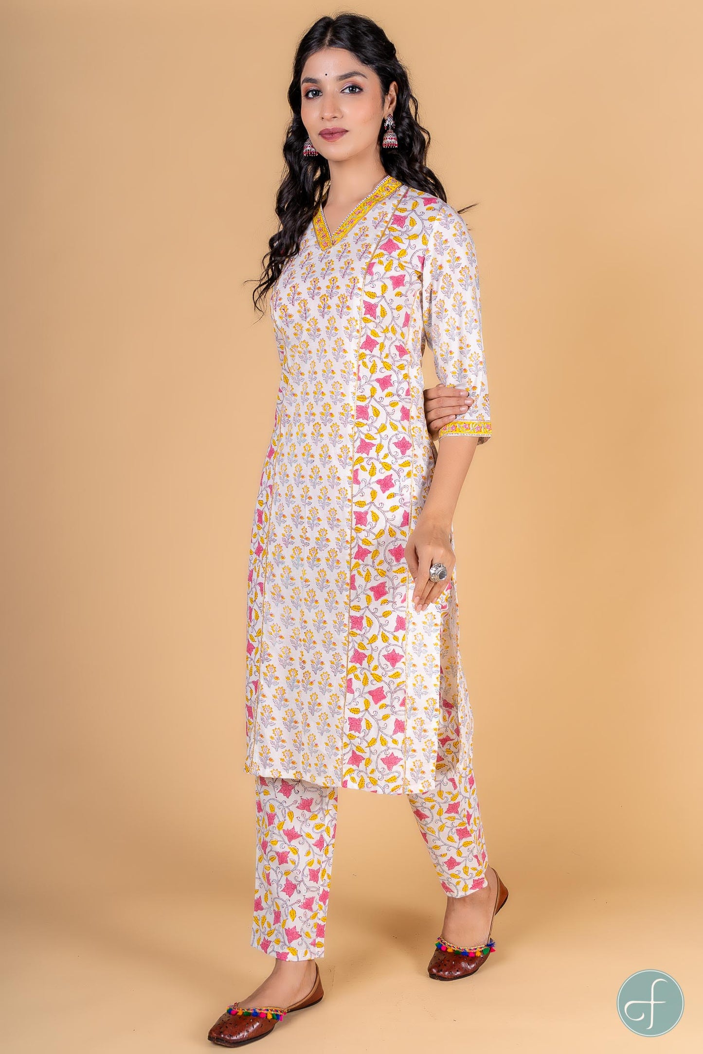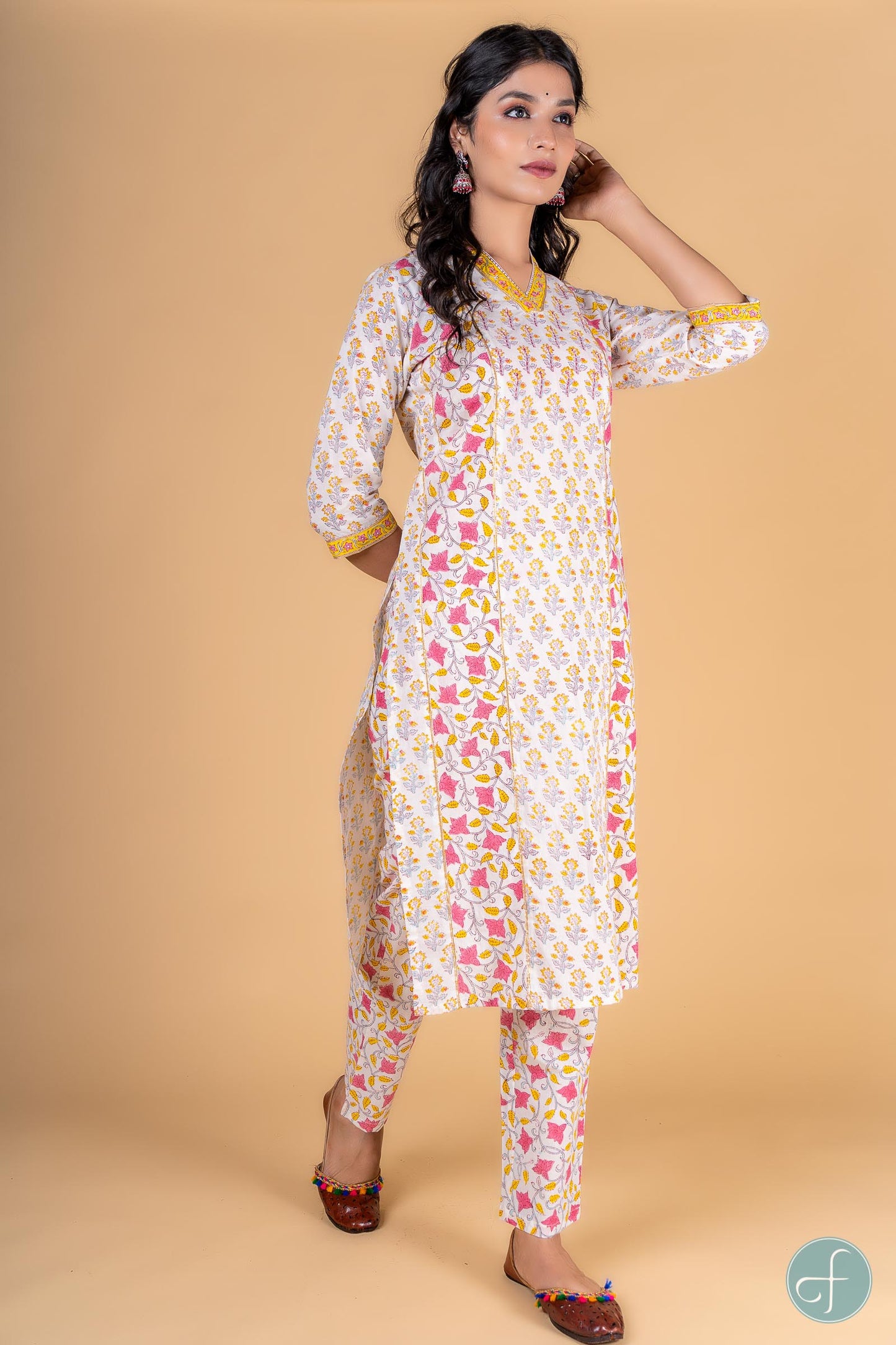 Straight fit kurta dipped in yellow and pink color with floral block print is a perfect choice for the summer season. This 3/4th sleeves kurta is embellished withsequins work at the yoke and border on the V shape neck and sleeves. Gota detailing can be seen on the sleeves and in the front sides as well. It is accompanied with block printed floral pant . Perfect for casual or office wear, this kurta is a must-have in your wardrobe to look stylish.